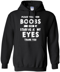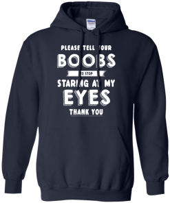 Funny shirt: Please tell your boobs to stop staring at my eyes T-shirt, Hoodie, Vneck, Tank, Long Sleeve