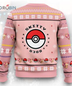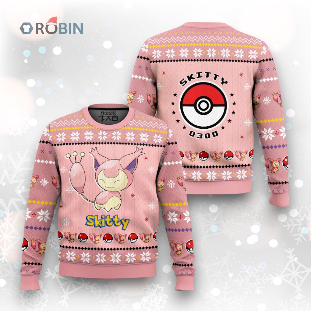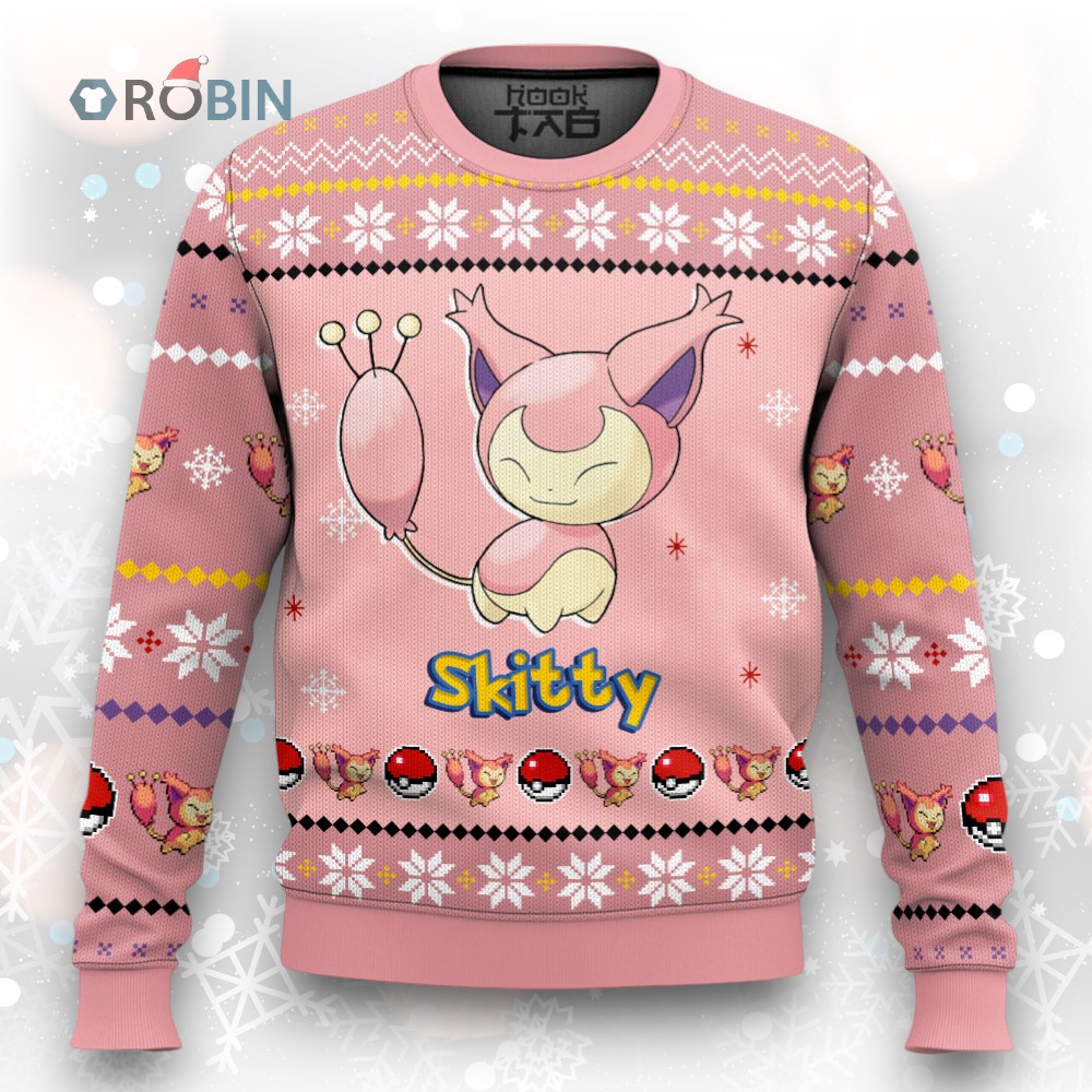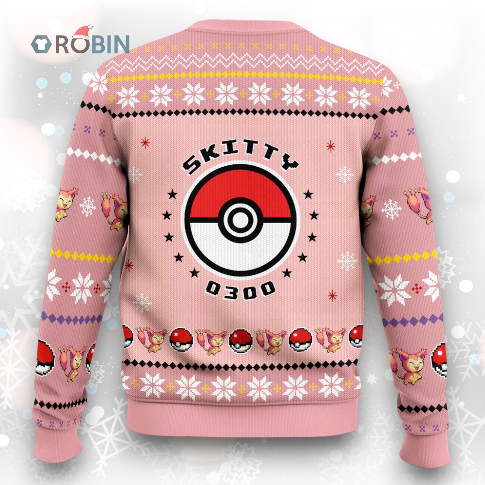 Show off your love for the adorable kitty pokemon this holiday season! This festive sweater features Skitty surrounded by snowflakes and holiday cheer. Perfect for adding a touch of cuteness to any Christmas party. Get yours today and spread the holiday spirit! Limited quantities available.