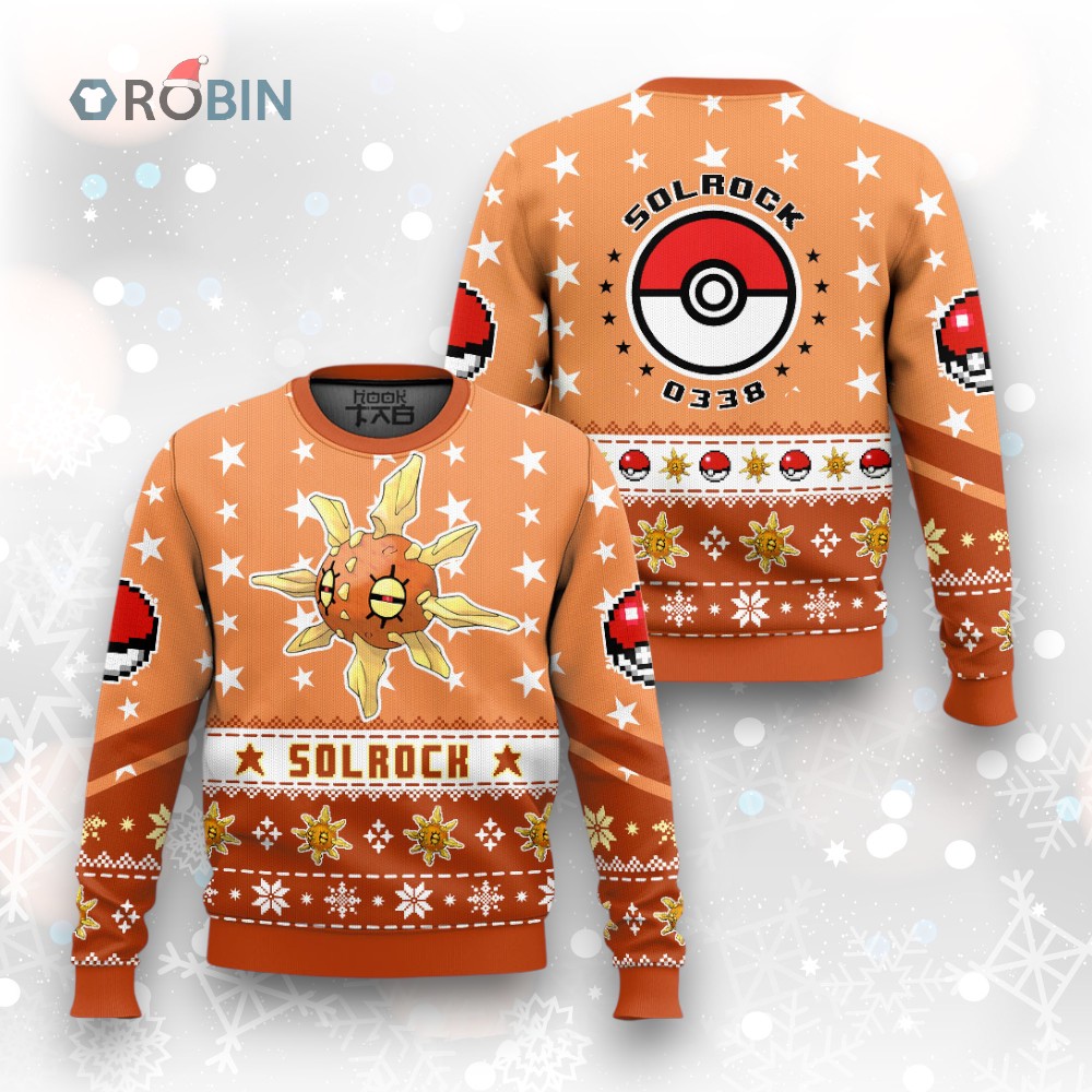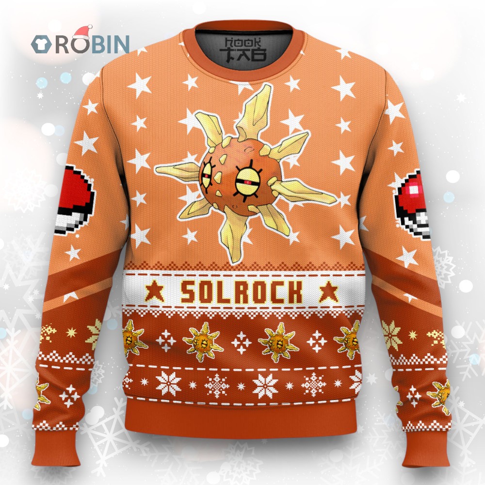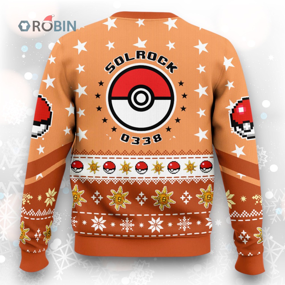 Shine bright this holiday season with this unique sweater! Featuring the radiant Psychic/Rock-type from Hoenn, it's the perfect festive apparel for any trainer looking to rock a quirky Christmas style. Get yours now and spread the sunny cheer!