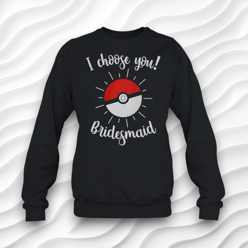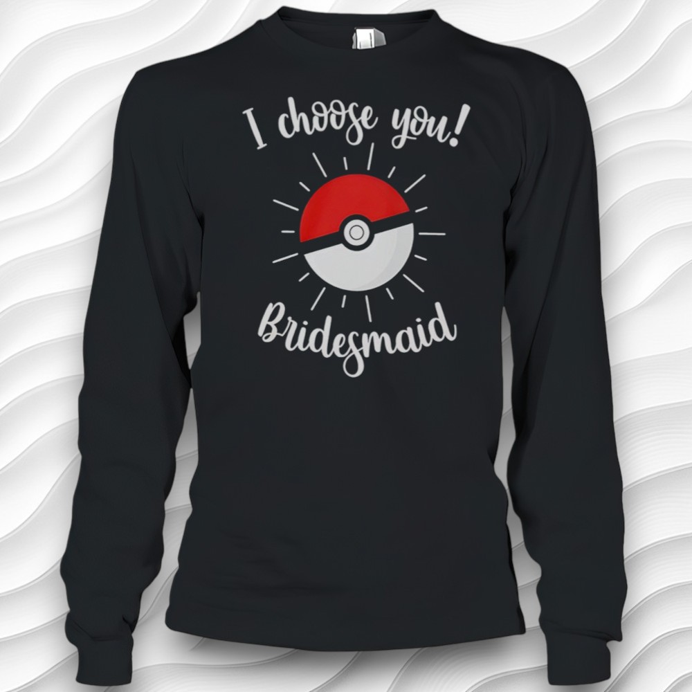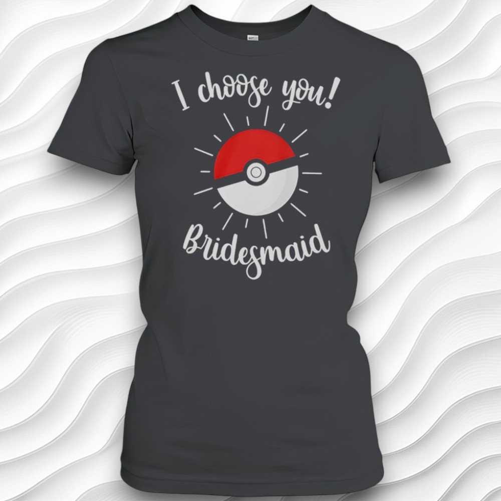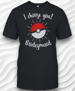 if you’re planning a wedding or a bachelorette party and have a group of friends who are low-key obsessed with Pokémon, you might want to check out this Pokémon wedding bridesmaid shirt. It’s super cute and playful, with that fun pop-culture twist that makes it stand out from typical bridal party gear. The shirt itself is a dark gray color, which feels a little more grown-up and versatile, but then it totally pops with this cool Poké Ball right in the center. The design isn’t just a flat graphic either—it has these radiating lines coming out from the Poké Ball that give it this energetic vibe, like it’s literally glowing with excitement. Above or below that, there’s this handwritten cursive text saying “I choose you! Bridesmaid,” which feels really sweet and personal without being overly formal. It’s got that relaxed, hand-done look that fits perfectly with the lighthearted wedding vibe. Honestly, I think this would be perfect for bridesmaids or even the whole bridal party if you want everyone to have a fun matching outfit for pre-wedding events like getting ready or a casual bachelorette bash. It’s something playful that also nods to a shared love of the Pokémon world without being too childish or cheesy. Plus, the colors—red, white, and black accents—work great on the dark gray so it’s easy to pair with jeans, skirts, or whatever you’re comfortable in. If a bride is really into Pokémon, this kind of shirt feels like a nice way to bring that personal touch to the celebration. As a gift idea, it’s great for bridesmaids who want a cute keepsake that also doubles as something they’ll actually want to wear again. It’s fun and celebratory, not your typical bride squad tee but with just enough charm to make everyone smile.