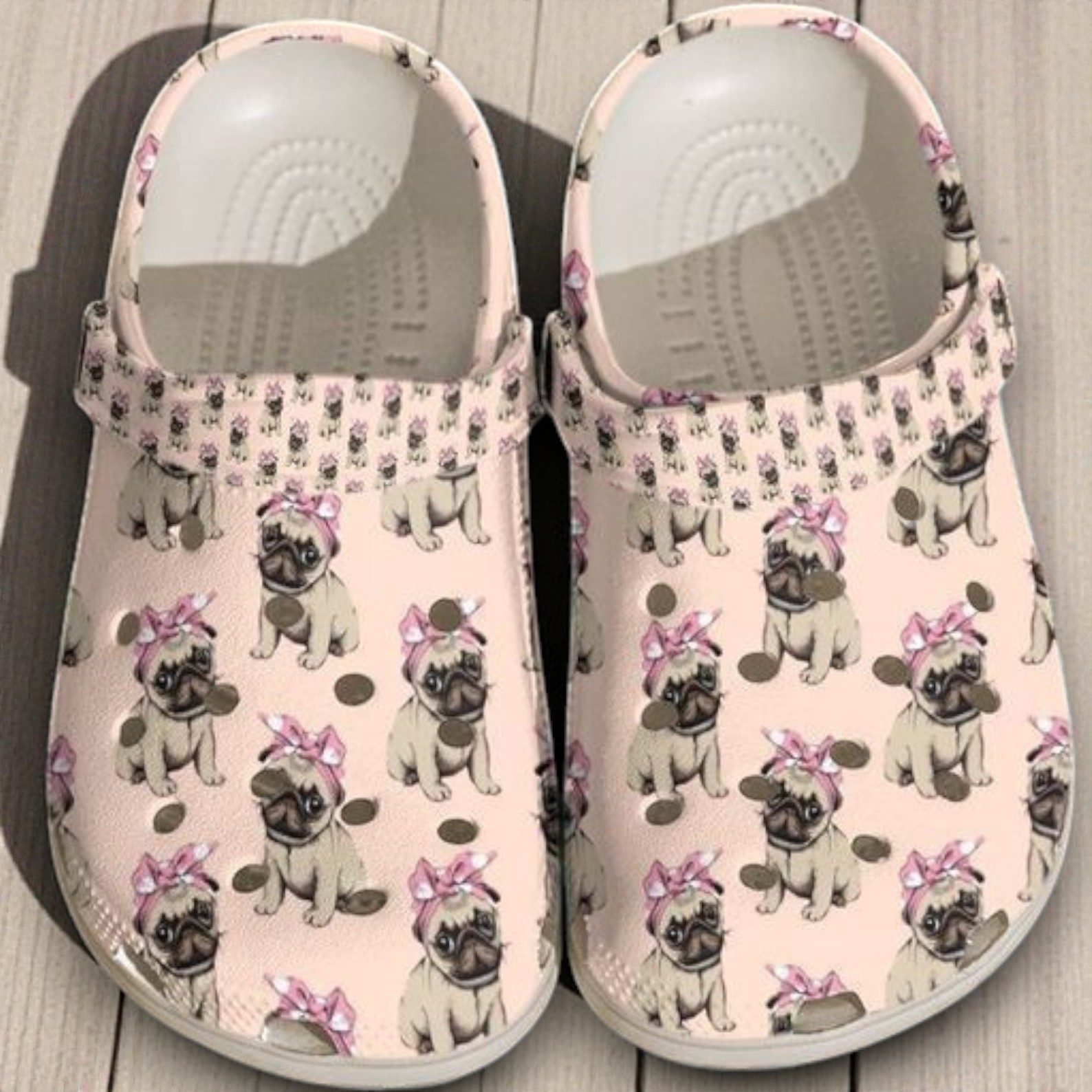There’s something quietly charming about choosing footwear that speaks to a specific affection—like a subtle nod to shared joy among fellow pug admirers. These Crocs carry a playful spirit with their soft pink background dotted by rows of cheerful pug illustrations. Each pug is adorned with a bow, adding a touch of whimsy that feels both lighthearted and endearing. The polka dots sprinkled around the pattern amplify the fun, making the design feel lively without becoming overwhelming. The pug pattern crocs are an unexpected little celebration of the breed’s quirky personality and undeniable cuteness. They suggest the wearer has a fondness for pets, a sense of humor, or simply a love for playful details in everyday life. Paired with casual shorts or a simple denim outfit, they bring a bit of levity and charm to daily routines. Layer on socks in coordinating pastels for cooler days or wear them bare on warm afternoons for maximum comfort. Parents choosing these for their little ones are gifting more than just shoes—they’re giving a cheerful, wearable statement piece that kids can grow fond of. Similarly, dog lovers who don’t mind showing off their pug pride in a relaxed, unpretentious way would slide into these at home, on errands, or casual outings without hesitation. The design is unmistakably joyful and approachable, much like the spirit of the breed it celebrates.