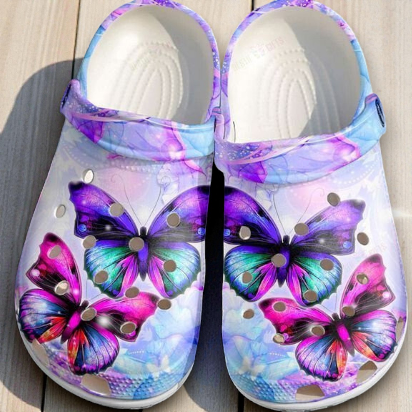 Brighten up your step with these beautiful butterfly shoes. The design features large, colorful butterflies in stunning shades of purple, teal, and pink, set against a soft, dreamy background that looks like a watercolor painting.