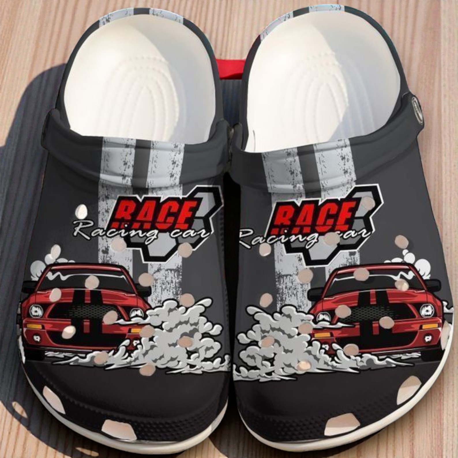 If you love fast cars and burning rubber, these custom racing shoes are for you. The design features a bold red muscle car drifting through clouds of tire smoke, set against a sporty background with grey racing stripes. The "RACE Racing car" logo adds the finishing touch to this high-speed look.