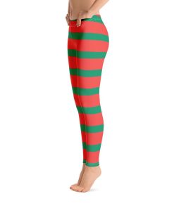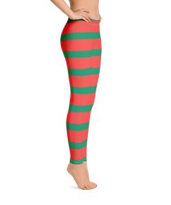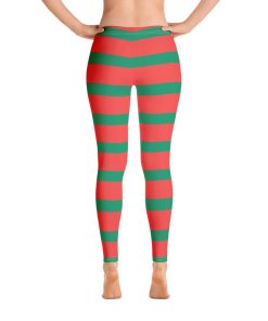 Red Green Striped Elf Christmas Leggings for Women, High Waisted Pants