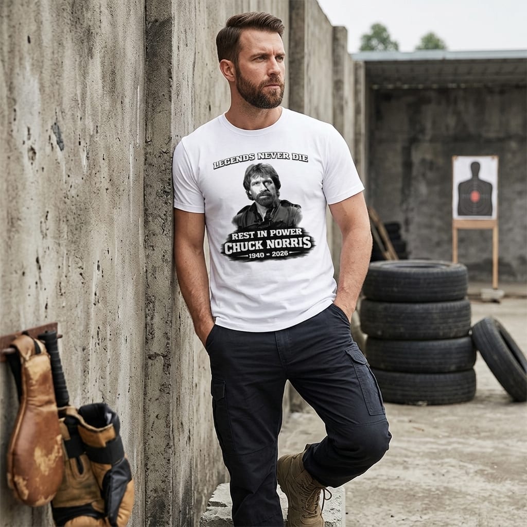There’s something about being a fan that goes beyond just liking someone—it’s about carrying their spirit with you. If Chuck Norris represents that legendary toughness and unshakable grit, then this shirt nails it. The design hits you right off the bat with a monochrome portrait of Chuck, capturing that iconic stare that says he’s seen it all and still stands undefeated. Around it, bold banner text wraps the image, featuring the slogan “LEGENDS NEVER DIE” in all caps, varsity-style block letters that feel both classic and battle-worn. The distressed edges of the print give it that rough-around-the-edges look, like a shirt that has been through some real stories but still holds pride. This one’s meant for guys who get the whole vibe—men who’ve grown up watching Chuck Norris deliver hard-hitting action or anyone who appreciates a bold tribute to a veteran icon. It’s not just a nod to a celebrity; it’s a way to wear something that carries weight and character. If you’re hunting for a gift that’s a little different—something with humor, nostalgia, and a rugged edge—this is a solid pick. Whether it’s for a birthday, a casual hangout, or just because, it’s a shirt that sparks conversation and respect without trying too hard. Fans of action heroes and those who admire the legend will find it impossible not to appreciate the message behind it.