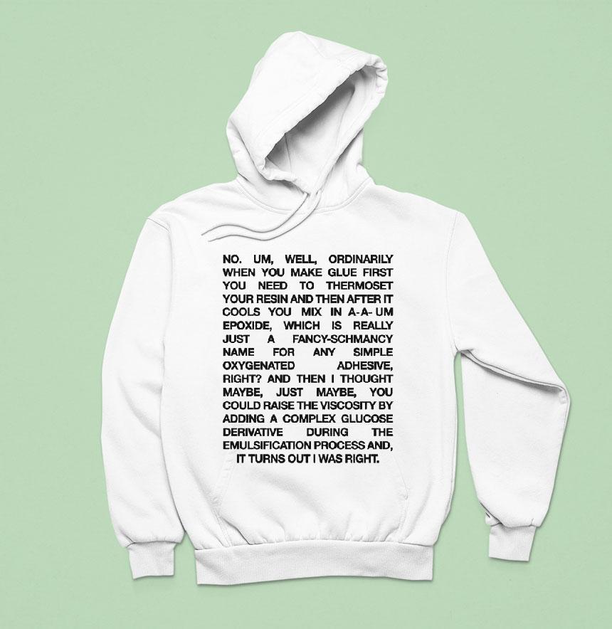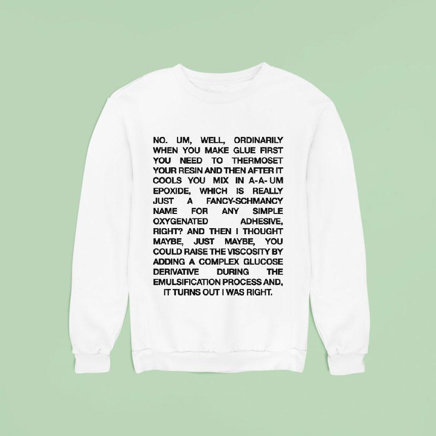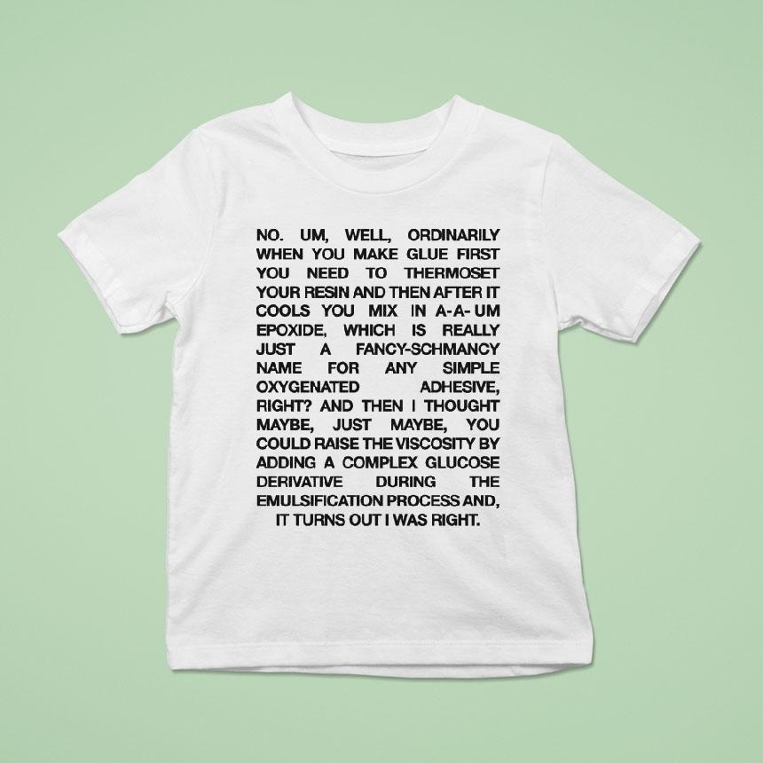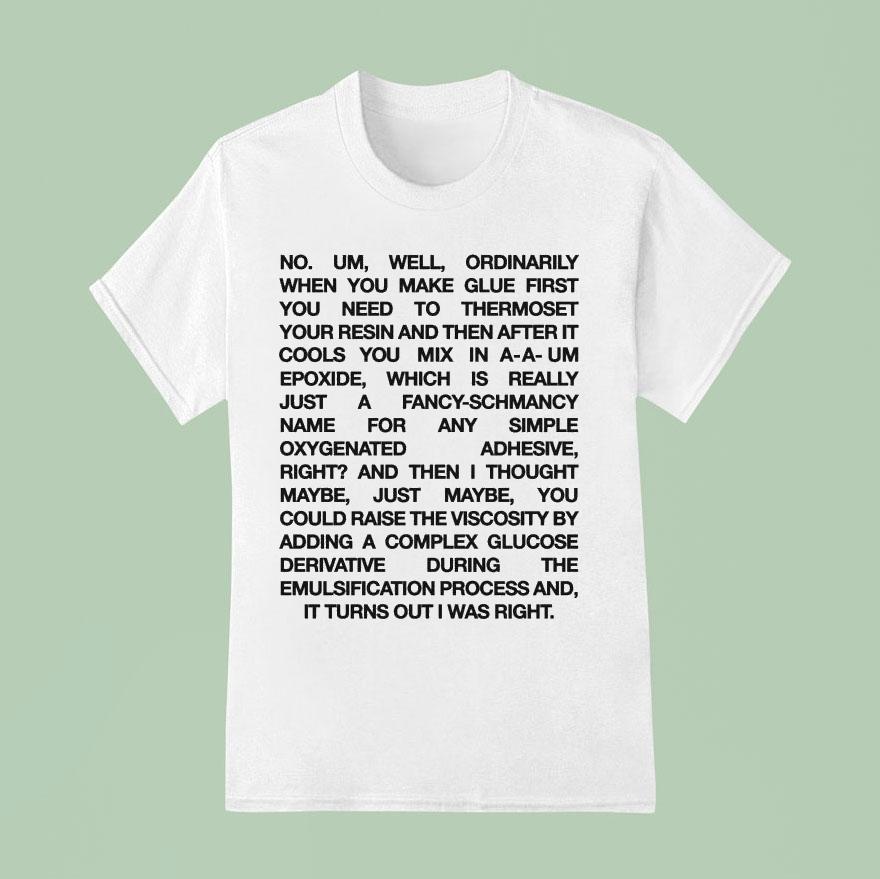 Black uppercase letters stack tightly together in a grid-like formation, creating a compact block of text that immediately draws the eye. The shirt’s white background amplifies the striking contrast, making each word stand out with a quiet intensity. The minimalist, all-caps sans-serif typography leans into a bold yet quirky vibe, giving off a retro feel that feels perfectly at home in both casual settings and nerdier circles. This design captures an unusual blend of pop culture and science humor, appealing directly to those who appreciate the offbeat charm of Romy and Michele’s irreverence paired with a nod to the chemistry behind Post-it Notes. It’s not just a shirt—it spells out a shared joke, a wink to anyone who recalls the characters’ unique chemistry in their iconic banter. Fans who relish subtle, text-based humor will find a kind of identity in its clean lines and precise layout. More than just fan apparel, this shirt functions almost like a conversation starter—ideal for a relaxed weekend gathering, a gift that sparks recognition and laughter among friends who dig smart, quirky references. Wearing this Romy and Michele shirt says you’re part of an inside joke, one that stands out quietly in a room but makes a memorable impression.
