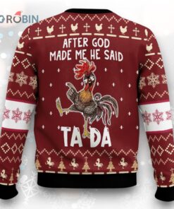 Cluck into the holidays with this hilariously festive sweater! Strut your stuff at your next ugly sweater party. Guaranteed to turn heads and spark some laughs. Grab yours before they fly the coop! Perfect for the poultry enthusiast in your life. Get ready to gobble up the good times!