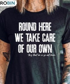 The Round Here We Take Care Of Our Own Trendy Unisex Tshirt Short Sleeve is a stylish and versatile piece of clothing that is perfect for both men and women. Made from high-quality materials, this t-shirt is comfortable to wear and will last you for a long time. Its round neck and short sleeves make it ideal for casual wear, while its trendy design adds a cool and modern touch to any outfit. With this t-shirt, you can show off your sense of style and proudly declare that you take care of your own.