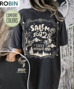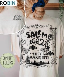 The Salem 1692 They Missed One Comfort Shirt 1692 Salem Massachusetts Short Sleeve Sweatshirt is a trendy and comfortable clothing item. With its short sleeves and cozy fabric, it is perfect for casual wear and lounging around. The shirt showcases the year 1692, referring to the infamous Salem witch trials that took place in Massachusetts. The phrase They Missed One adds a touch of humor and intrigue to the design. The shirt is not only fashionable but also a conversation starter, making it a must-have for history buffs and fans of unique apparel.