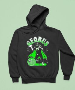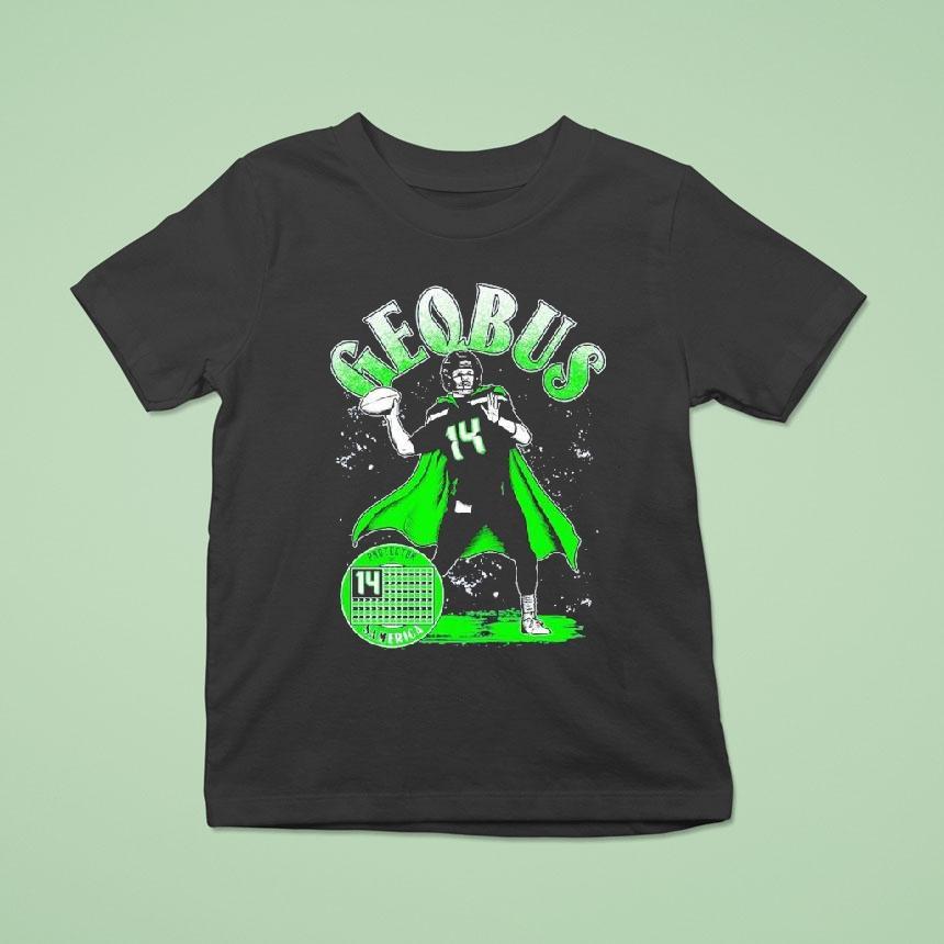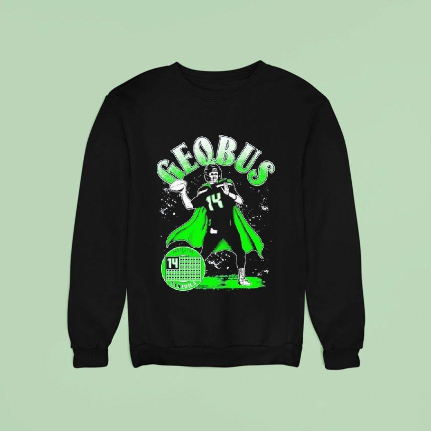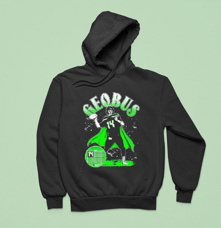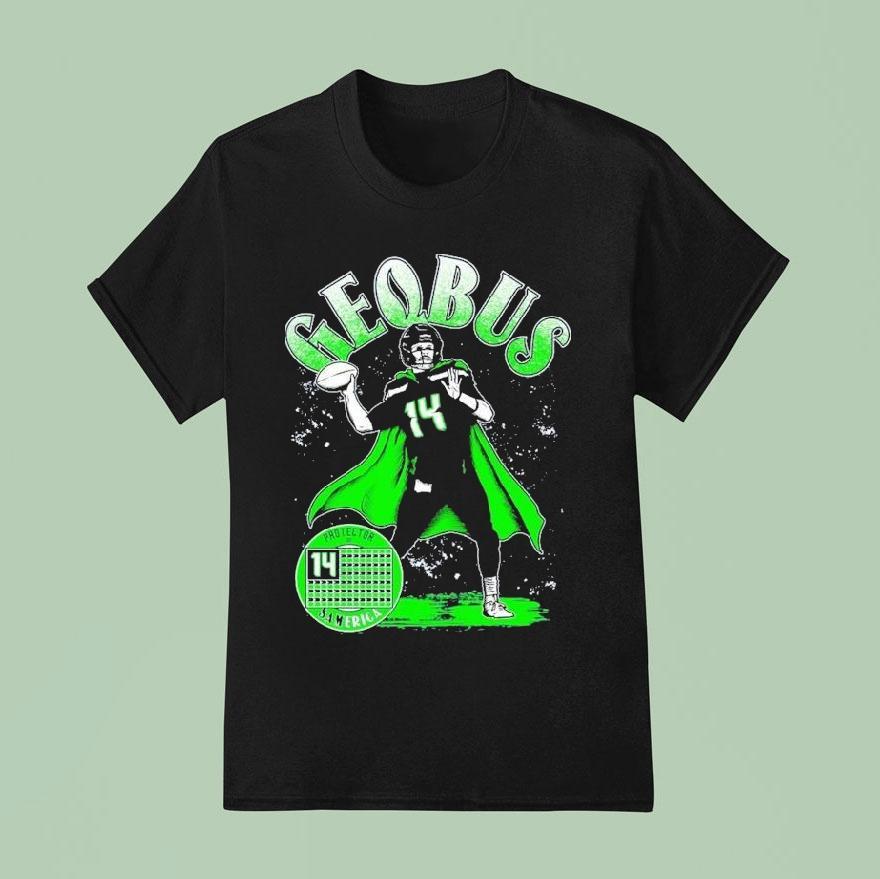 The first thing you notice is the bold green cape flowing dramatically behind the figure of Sam Darnold, frozen mid-stride like a comic book hero caught in a decisive moment. This isn’t your average sports tee—it’s a playful twist on hero worship, stitched right into the design with a strong retro vibe. The word “GEQBUS” arcs across the chest in thick, serif-like letters that demand attention, mimicking the look of classic team logos but with a quirky spin that pokes fun at the usual Seattle Seahawks branding. Beyond the cape and lettering, the circular badge with numbers catches the eye next—styled like a vintage football jersey number patch. The entire backdrop is energized by a dynamic splash effect, like the burst of excitement on game day or the rush you get cheering from the stands. It captures the spirit of someone who roots hard and loves a bit of humor alongside their fandom. This design feels like it was made for folks who don’t just watch the game but live it, especially fans of Sam Darnold who appreciate a nod to his unique journey. Whether you’re a Seattle Seahawks supporter, a collector of clever sports meme tees, or just someone who loves standing out at casual meetups, this shirt fits. It’s also an easy choice for gifting—something fresh and a little unexpected for that football lover in your life. Wearing this Sam Darnold geqbus seattle seahawks protector shirt is like carrying a bit of game day energy wherever you go, whether you’re heading to a tailgate or just hanging out with friends.
