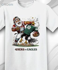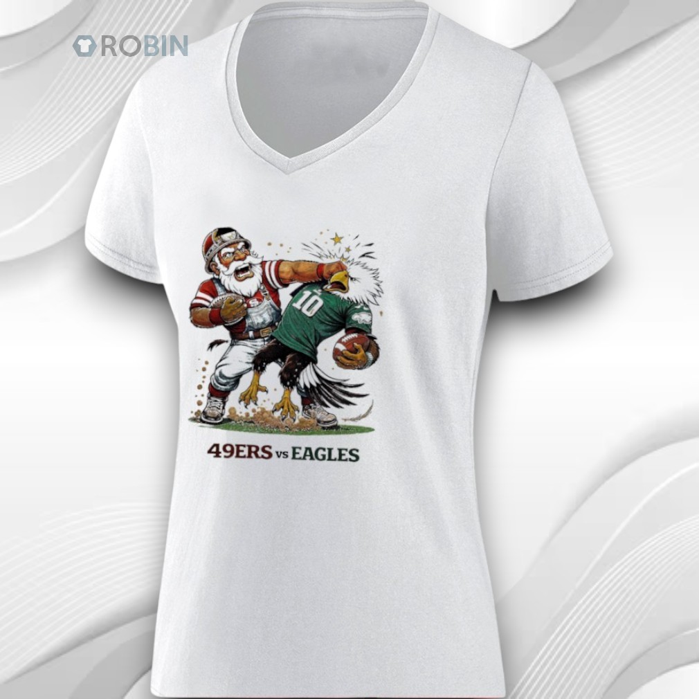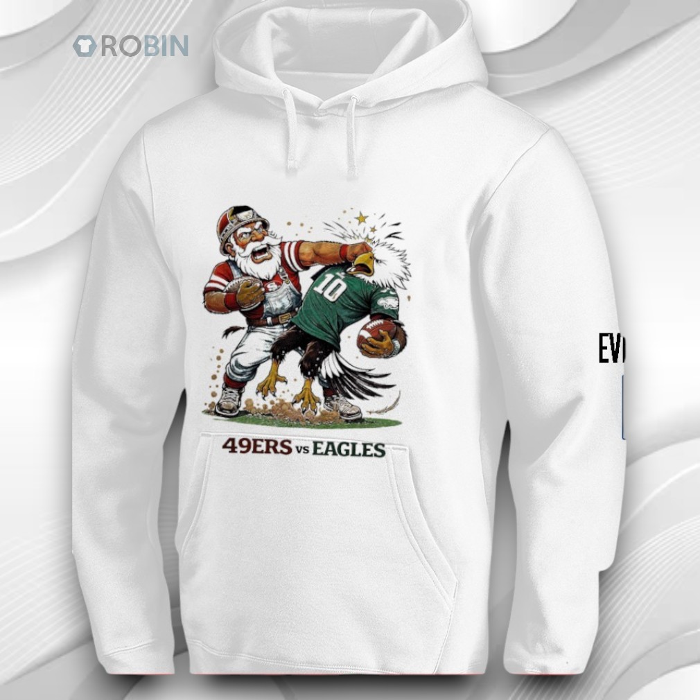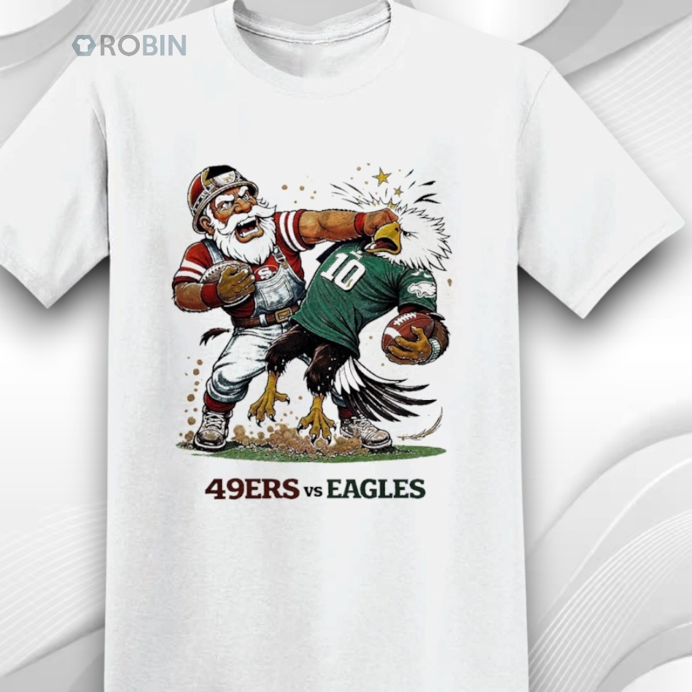 The bold cartoon-style artwork shows the classic 49ers vs Eagles showdown in a playful and energetic way that instantly grabs attention.