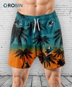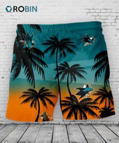 Rep your Sharks in style with these awesome Hawaiian shorts! Perfect for summer BBQs, beach days, or just lounging around. Features a fun coconut tree design. Grab yours today at the San Jose Sharks store or online! Show your team pride in a unique way. Limited quantities available!