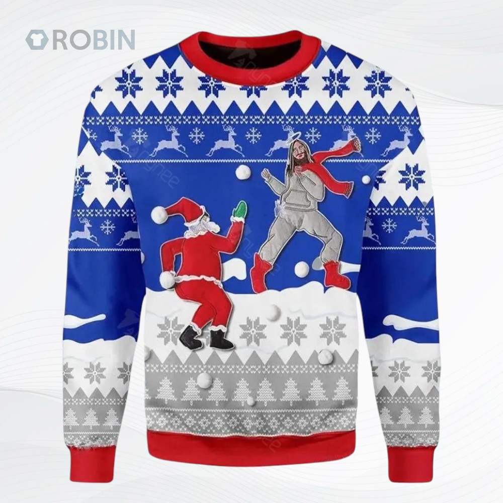 Who would win in a snowball fight—Santa or Jesus? This playful sweater captures the heart of Christmas with its whimsical design, featuring Santa and Jesus joyfully tossing snowballs. It's a fun twist on holiday tradition, sure to spark smiles and conversations. Wear this and spread cheer wherever you go. Ready to add some festive fun to your wardrobe? Grab yours today!