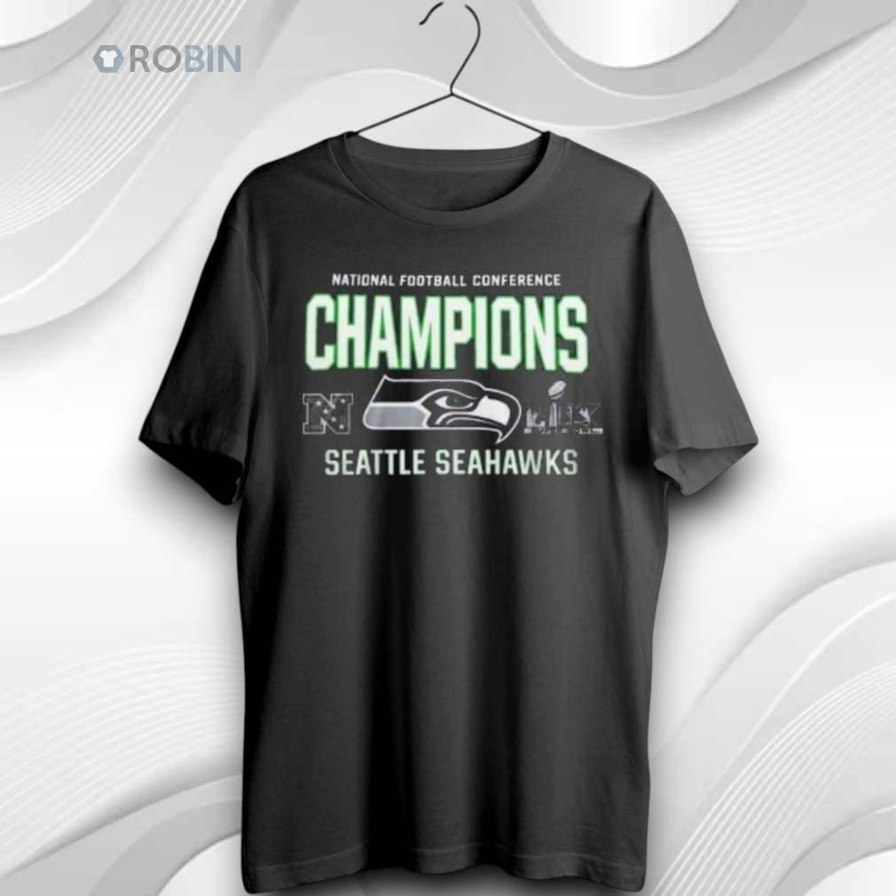 Celebrate the dominance of the Hawks in the National Football Conference! This design captures the glorious moment the Seattle Seahawks punched their ticket to Super Bowl LIX. Featuring the sharp team logo centered between a bold, radiant "CHAMPIONS" headline, this shirt is a testament to the relentless fighting spirit of the 12s.