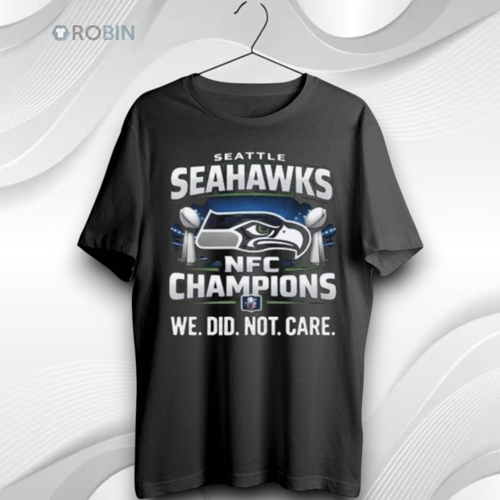 Featuring the iconic Seahawks logo flanked by twin trophies, this design serves as a permanent reminder of conference dominance. The "We. Did. Not. Care." slogan sits boldly at the bottom, making a statement that resonates way beyond the stadium. Whether you’re heading to Lumen Field or watching from across the pond, wear the history that defined a championship era.