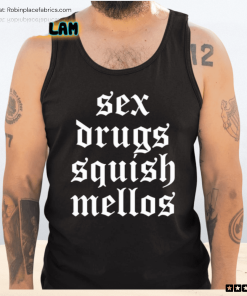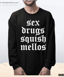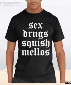 Sex Drugs Squish Mellos Shirt is a unique and eye-catching design that combines bold colors and funky graphics. The shirt features a vibrant mix of psychedelic imagery, including trippy patterns, colorful squishy shapes, and playful cartoon characters. The overall aesthetic is fun, playful, and slightly edgy, making it a standout piece for anyone looking to make a statement with their wardrobe. The high-quality fabric and comfortable fit ensure that this shirt will be a go-to favorite for casual and carefree outings.