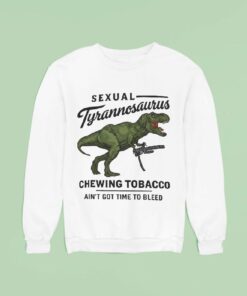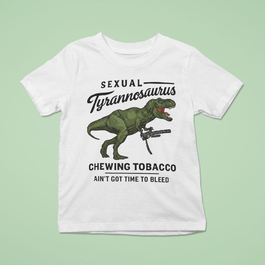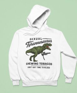 A vivid green Tyrannosaurus commands attention at the center of this shirt, gripping a weapon that adds a touch of playful menace. The contrast between the dinosaur’s intense color and the deep black background brings sharp focus to every detail of the design. Bold, uppercase typography anchors the top and bottom of the composition, while the word Tyrannosaurus curls in cursive script, softening the overall tone with a hint of retro charm. It’s a clever balance between edgy and nostalgic, capturing a rebellious spirit that resonates well beyond the image. The design’s bold graphic style and retro lettering nod to both sports culture and meme humor, making it a natural choice for anyone who enjoys a clever mashup of past and present pop references. With its playful yet defiant mood, this shirt fits the personality of sports fans who appreciate something a bit offbeat, or meme enthusiasts who value creativity with attitude. It’s more than just a visual joke—it’s a statement piece that speaks to a crowd that embraces bold identity and irreverence. Wearing this kind of design works just as well at casual gatherings as it does among friends who share a love for sports memes or niche humor. It suits someone who finds joy in expressing a layered personality through what they wear, blending sports fandom with an unmistakable edge. The reference to Sexual Tyrannosaurus Chewing Tobacco isn’t simply a tagline; it’s part of a culture that celebrates the unexpected and the unforgettable in everyday style.