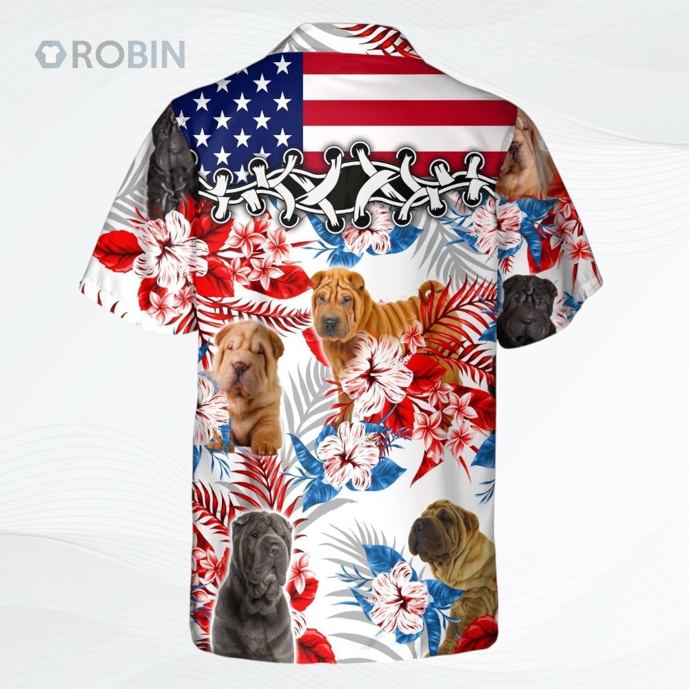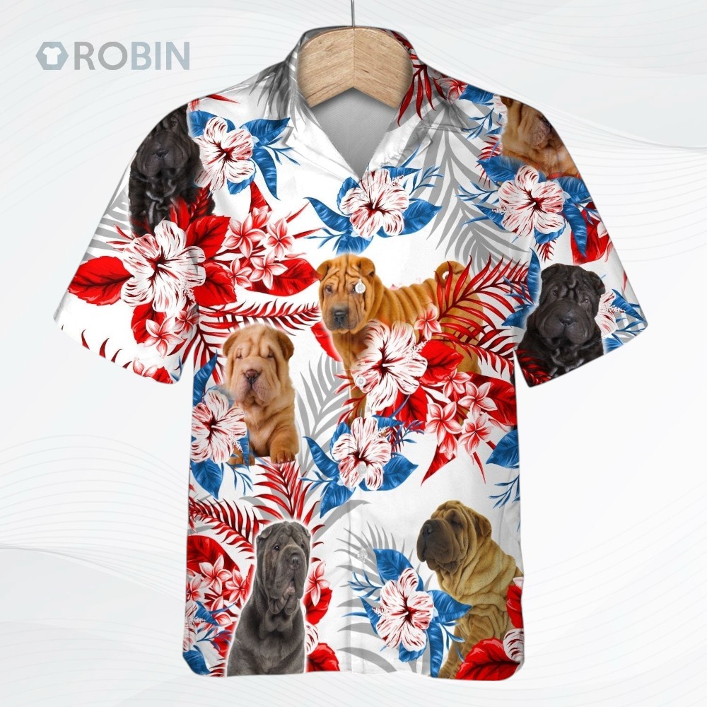 Step into summer with a vibrant blend of Shar Pei charm and tropical flair. This design features adorable Shar Pei dogs surrounded by lush red and blue hibiscus flowers, capturing the essence of a beach getaway. Whether you're a dog lover or a fan of unique, eye-catching patterns, this shirt is your ticket to standout style on sunny adventures.