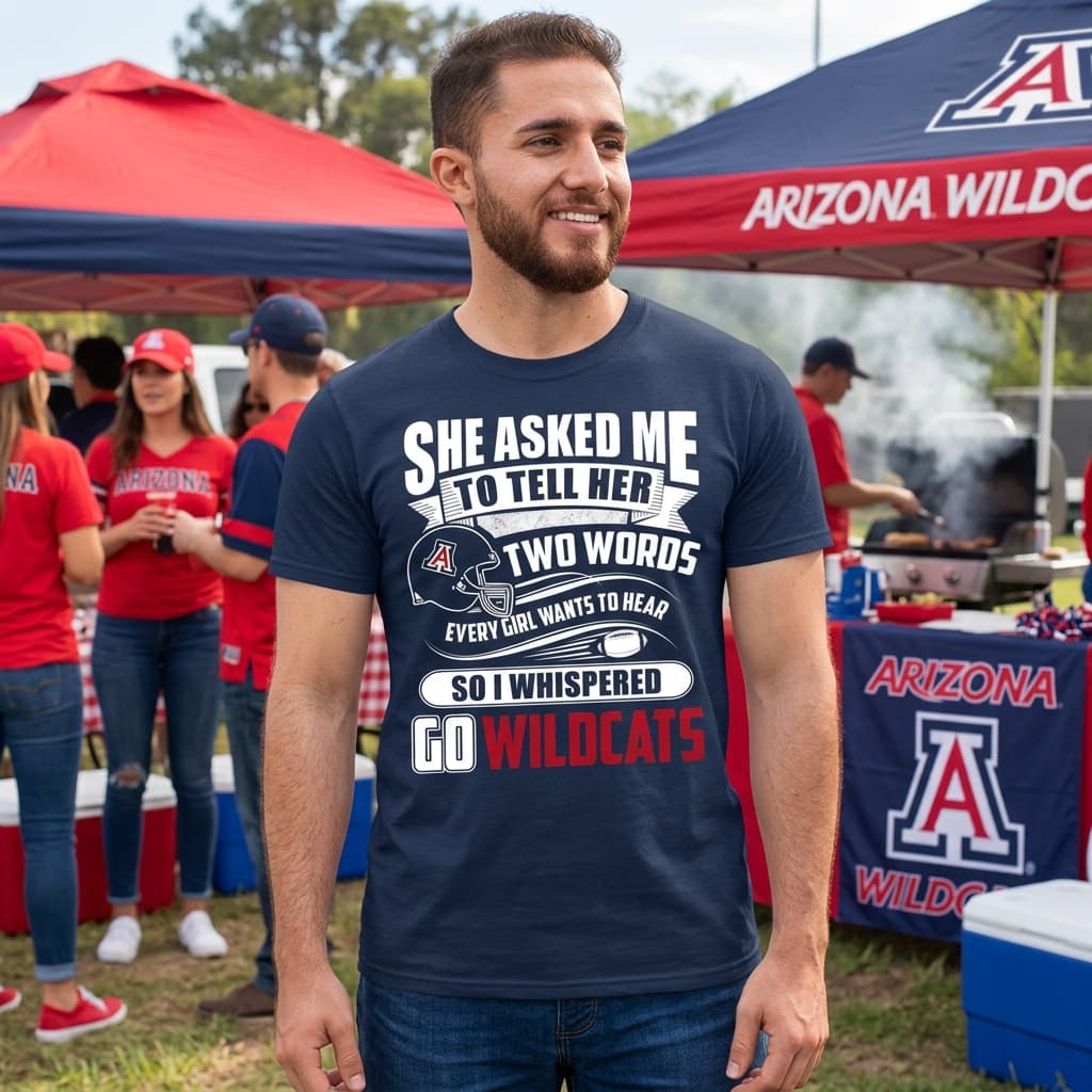 Bright block letters stretch boldly across the chest, each character outlined in the unmistakable red and blue of the Arizona Wildcats. The phrase “She Asked Me To Tell Her Two Words” leads the eye, set in varsity-style typography that carries the unmistakable energy of college game day. Below, a gleaming helmet graphic anchors the design, its glossy curves catching the eye without overwhelming the text. Ribbon-like banners frame the whole composition, adding a touch of vintage flair while reinforcing a spirited, collegiate vibe. This shirt doesn’t just declare team loyalty—it reflects the kind of fan who wears their personality as loudly as their colors. It’s for those who embrace the playful side of fandom, who enjoy the camaraderie and confident banter that come with cheering on the Wildcats. The shirt fits easily into the rhythm of tailgates or meetups, where a strong sense of belonging mixes with a lighthearted approach to fandom. More than just a piece of sport-themed apparel, it stands as a quiet nod to shared moments and inside jokes between supporters. Anyone drawn to the bold graphic and clear nod to Arizona Wildcats pride will find this shirt speaks to a personal style rooted in spirited enthusiasm and individuality. Whether caught in the roar of the stadium or relaxing with friends afterward, this Arizona Wildcats shirt carries with it an easy confidence rooted in genuine connection.