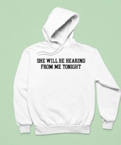 Black capital letters dominate the front of this shirt, tightly spaced and commanding attention without any distraction. The phrase she will be hearing from me tonight sits squarely in the center, using a strong, condensed sans-serif font that feels unapologetically bold yet minimal. The sharp weight of the typography controls the energy—a wink of assertiveness in a crowd of casual tees. This isn’t just about words; it’s about the attitude they convey. Wearing this shirt signals a kind of playful confidence, the kind of person who enjoys a little cheek in their interactions and embraces that knowing smirk before any actual words are exchanged. It’s a visual announcement that reflects a certain social ease, one that’s perfect for those who appreciate humor twisted with a hint of dare. The simplicity of the black-on-white design highlights the message without fluff, making it ideal for folks who lean toward straightforward self-expression rather than subtlety. Partners who like to tease or friends who enjoy cutting banter would naturally gravitate toward this. Its bold presence fits seamlessly in casual settings where conversation starters matter more than style complexity. Ultimately, this shirt articulates a mood with clean precision—a reminder that sometimes, a line from your wardrobe says everything before you even speak.