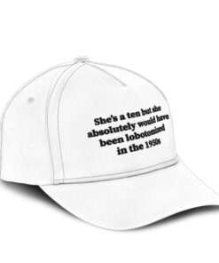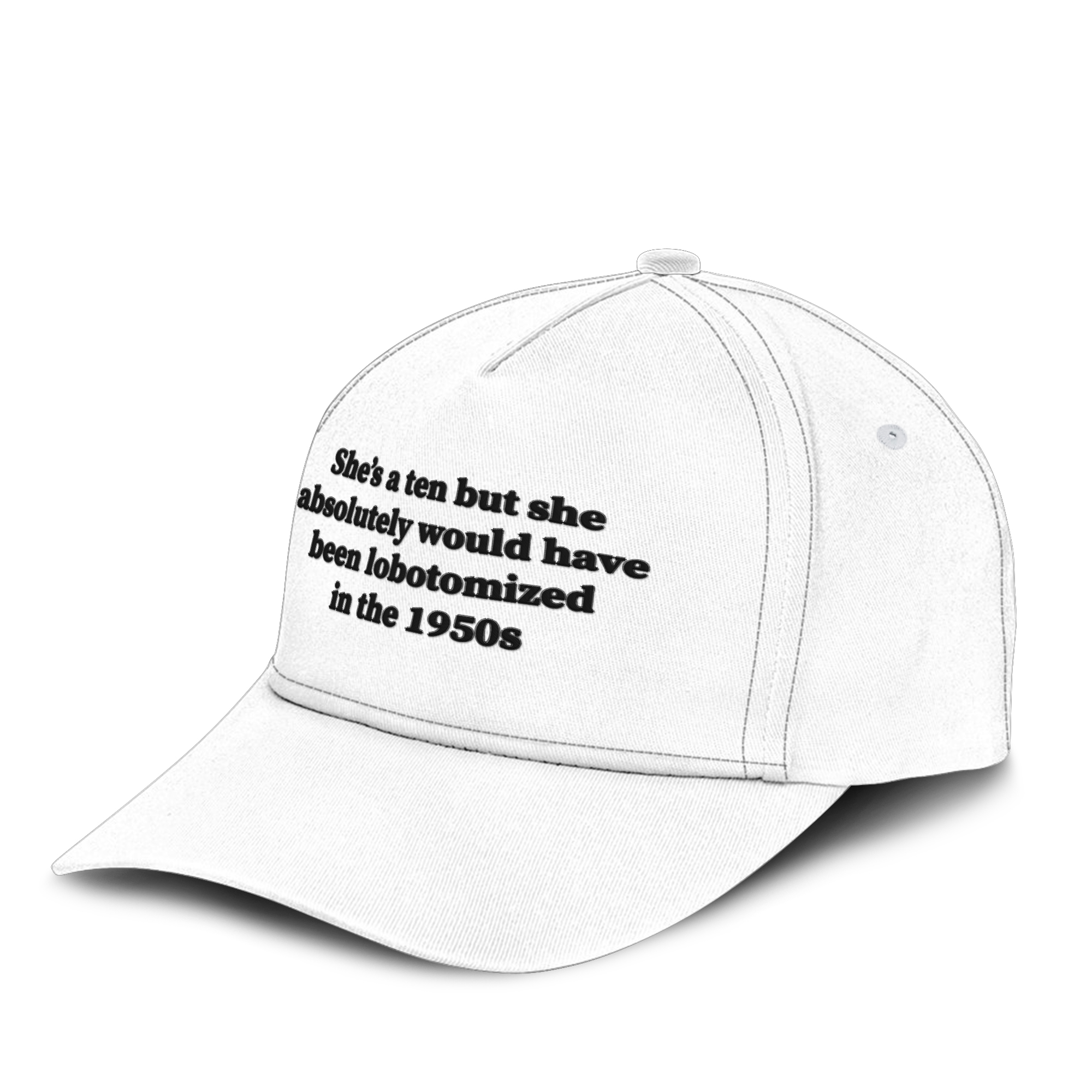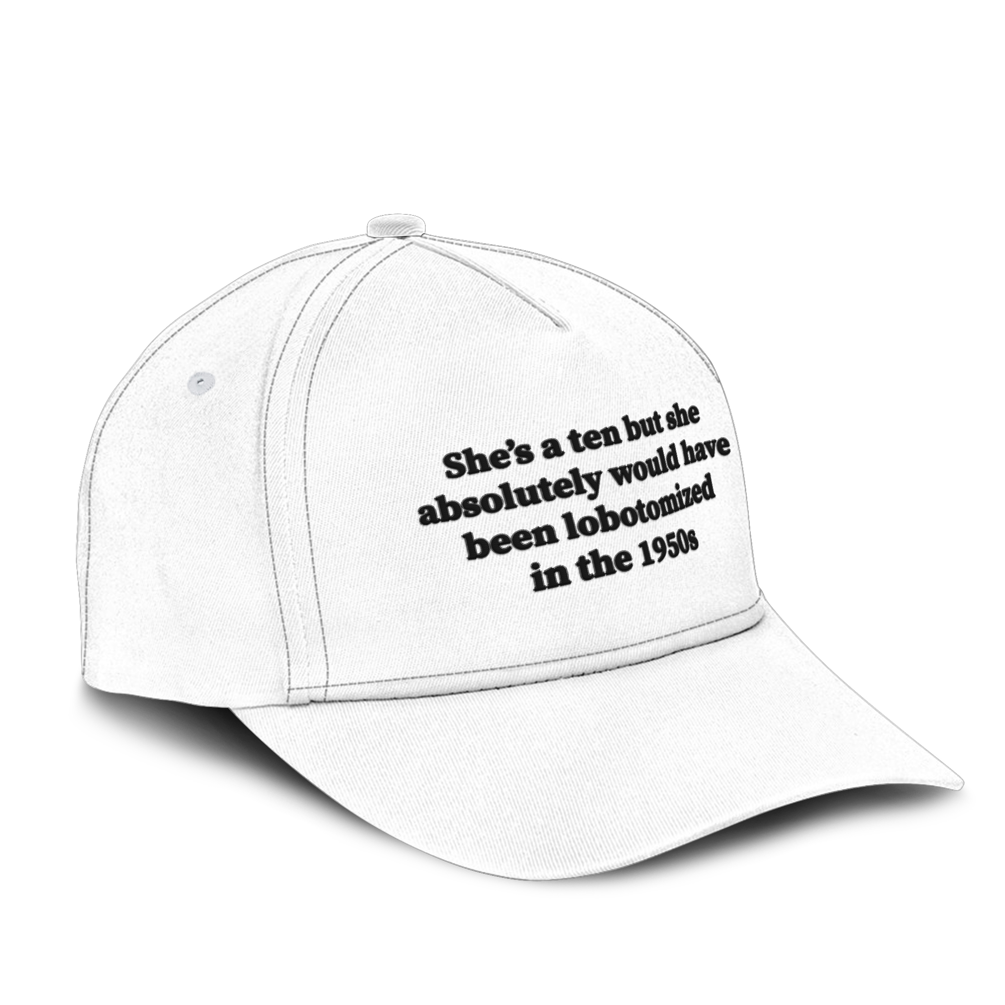 Dark humor with a history lesson baked in. This embroidered cap flips the “she’s a ten” trend into a sharp, uncomfortable reminder of how quickly women were labeled “difficult” — and how brutal the “solutions” used to be.