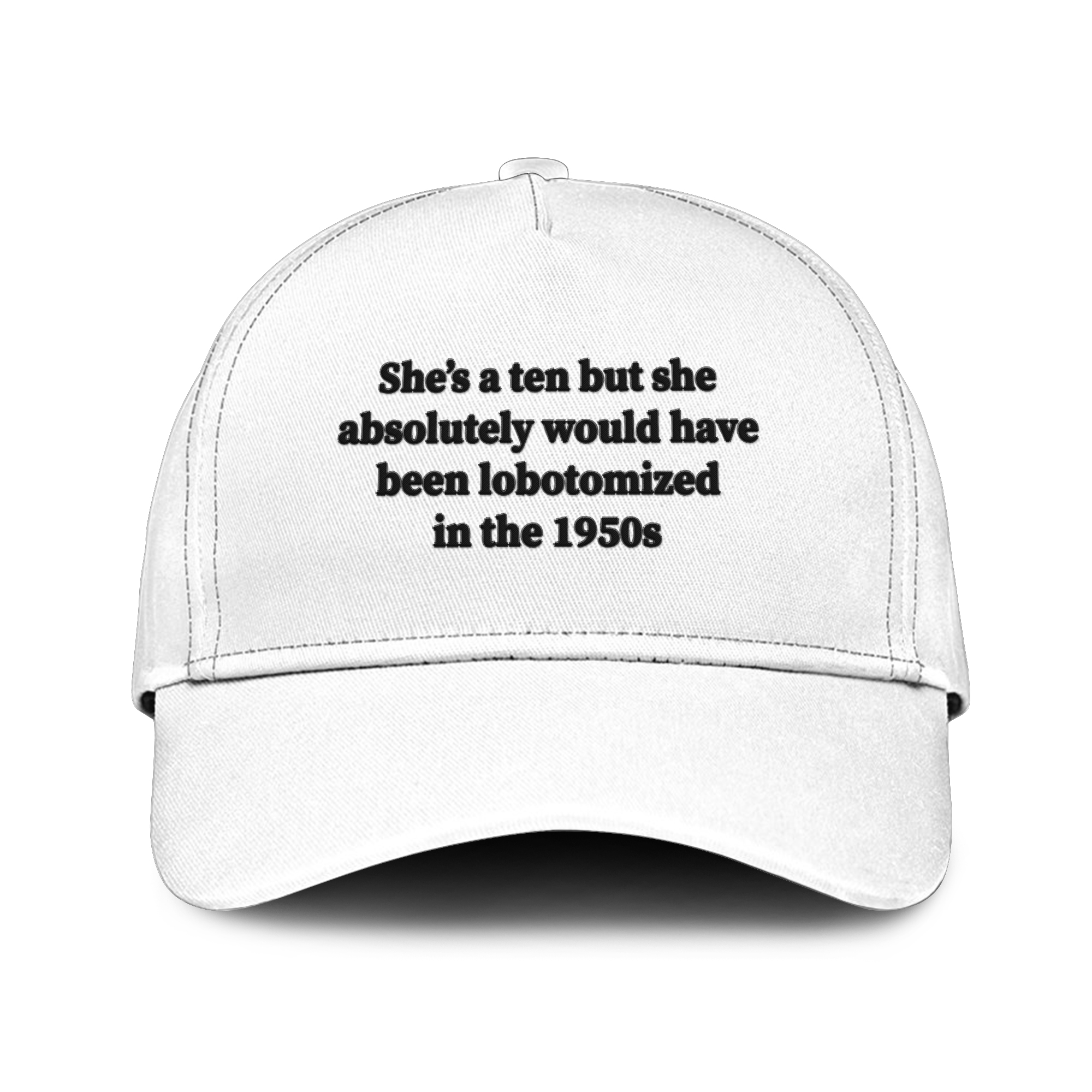 Front embroidery: “She’s a ten but she absolutely would have been lobotomized in the 1950s”