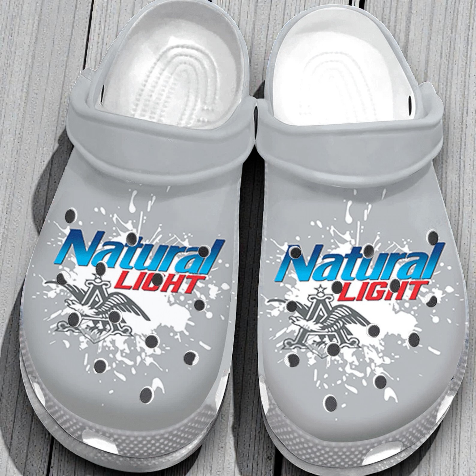 The muted grey backdrop of these clogs serves as the perfect canvas for a punchy burst of color, where bold blue and fiery red text collide in an effortless splash paint motif. The words “Natural Light” burst across the shoe in a weighty sans-serif font, slanted with just enough italic energy to suggest movement, not stillness. This isn’t just footwear; it’s a statement with attitude—dynamic, lively, urban. The emblem tucked into the design grounds it with a subtle nod to brand identity, but it’s the splash of paint that truly captures the spirit of someone who refuses to blend in. These clogs speak to an urban lifestyle with a sporty edge, the kind that thrives on the rush of a casual day out in the city streets or a spontaneous meet-up with friends. They carry an energy that matches well with relaxed jeans, vintage tees, or even a casual athleisure look. Natural Light clogs appeal to those who value comfort without sacrificing boldness. Whether gifting them to a friend who’s all about laid-back style or slipping them on yourself for a weekend where easy meets expressive, these shoes fit effortlessly into a life lived with personality. It’s the footwear choice for anyone who sees casual as their canvas and isn’t afraid to color outside the lines.Simple Grey Natural Light Clogs Shoes