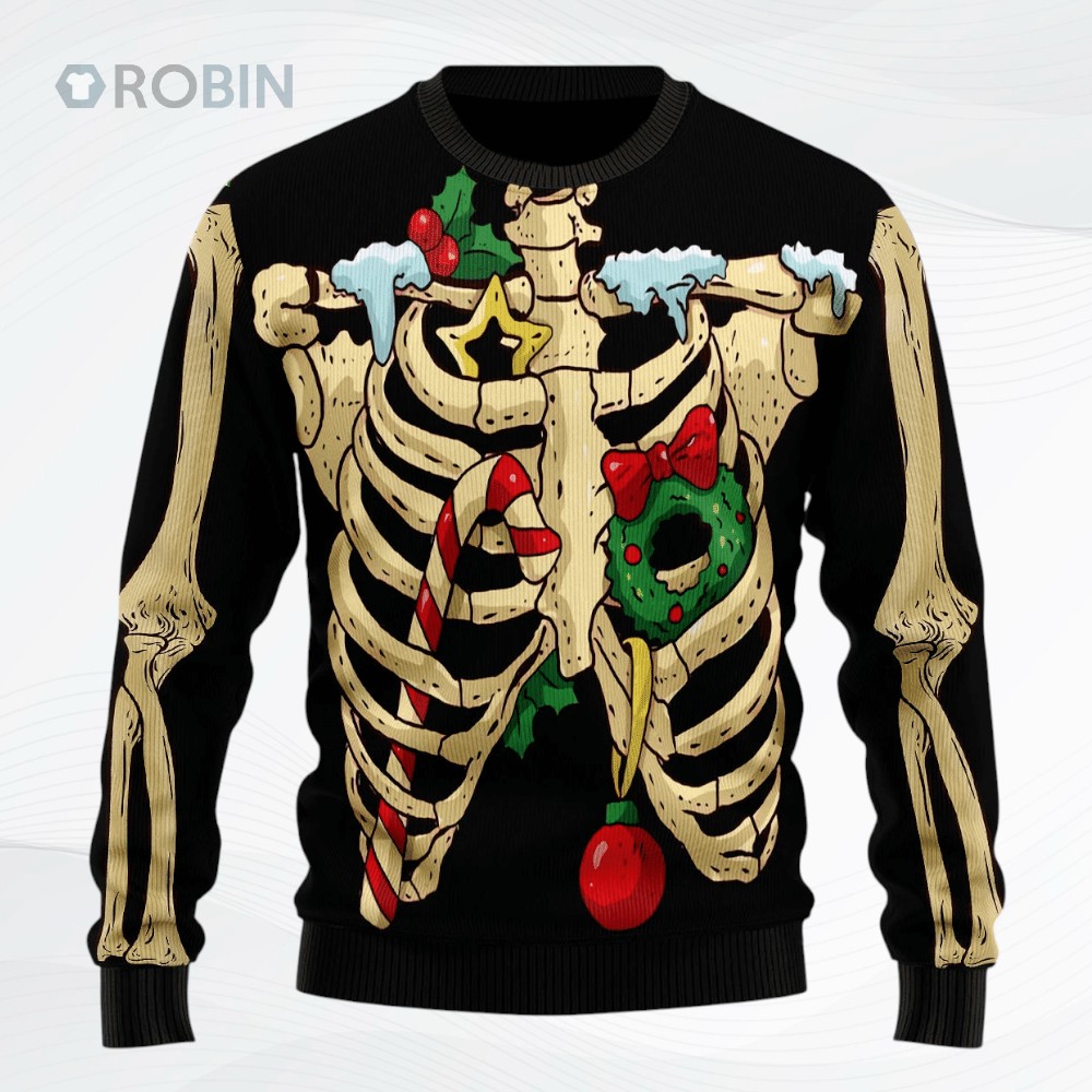 Ever thought a skeleton could be this festive? This sweater combines spooky fun with holiday cheer, featuring a ribcage adorned with candy canes, wreaths, and ornaments. It's the perfect mix of edgy and merry, ensuring you stand out at any Christmas gathering. Ready to bring some unconventional joy to the party? Grab yours now and let the celebrations begin!