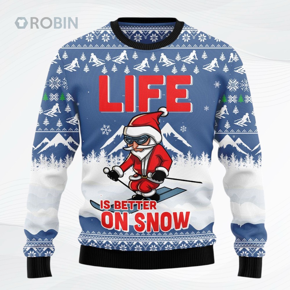 Ever imagine Santa hitting the slopes? This cheerful sweater captures the magic of winter with Santa skiing down snowy peaks, surrounded by festive patterns and a bold message that speaks to every snow enthusiast's heart. Perfect for holiday gatherings or cozy nights by the fire. Slide into the season with a smile and grab yours today!