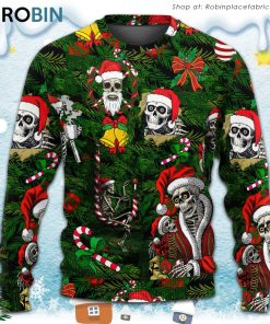 Celebrate the holiday season in style with the unique and eye-catching Skull Merry Xmas Happy Christmas Ugly Christmas Sweater. This festive sweater features a bold and edgy skull design, adding a touch of rock and roll to your Christmas attire. The vibrant colors and intricate detailing make it a standout piece for any holiday gathering. With its cozy and comfortable fit, you can stay warm while spreading holiday cheer. It’s the perfect way to show off your individuality and celebrate the most wonderful time of the year with a twist. Whether you’re attending an ugly Christmas sweater party or simply want to stand out this holiday season, this Skull Merry Xmas Happy Christmas Ugly Christmas Sweater is a must-have addition to your wardrobe.