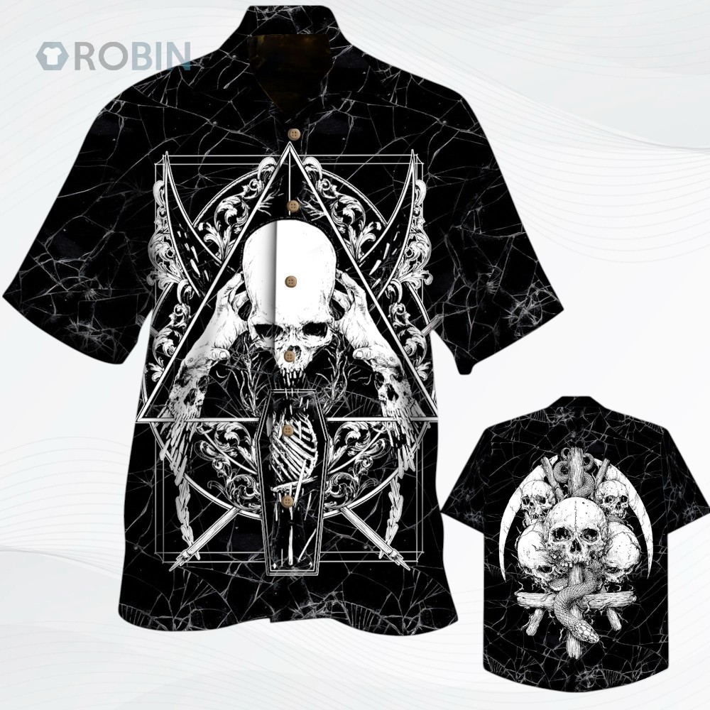 Unleash your bold style with this all-over printed Hawaiian shirt. Featuring an intricate skull design entwined with mysterious symbols, it’s a perfect blend of edgy and artistic. This striking pattern adds a touch of gothic flair, making it ideal for those who want to stand out in any crowd. The shirt's unique design is sure to capture attention and spark conversation.