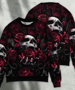 This unique and eye-catching sweater is perfect for those who want to make a bold fashion statement during the holiday season. With its dark and mysterious design, it features a skull and rose motif, centered around a blood red color. The skull and rose are intricately detailed, creating a striking visual. Adding an element of horror and intrigue, the sweater also includes a screaming face in the background, further adding to its edgy appeal. This sweater is sure to stand out at any Christmas party or gathering, guaranteeing that you’ll be the center of attention.