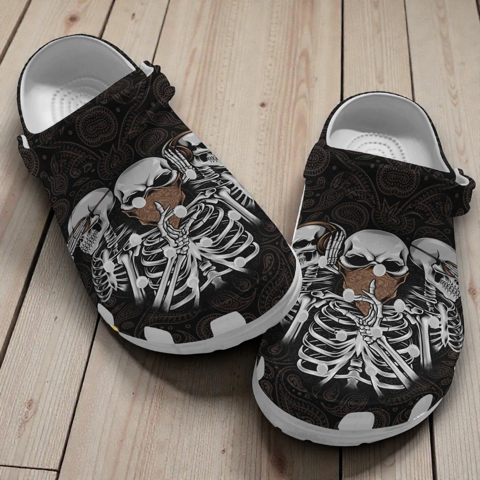 Bold and unapologetic, these clogs turn a casual choice into a statement of identity. The skull tattoo hippie shoes merge gothic edge with a playful spirit, their design anchored by intricate skeletons and skulls that weave through a dark paisley background. White and brown highlights add contrast and depth, making each bone and curve stand out without overpowering the overall composition. The artistry here feels like a conversation between rebellion and whimsy, tailored for someone whose style reflects both toughness and a hint of free-spirited flair. These clogs suit those comfortable straddling the line between dark aesthetics and laid-back comfort—people who appreciate footwear that doesn’t shy away from character or detail. Outfits that echo this design might come from a wardrobe mixing worn-in denim and leather, or even bohemian prints softened by time and wear. Whether worn around town or given as a thoughtful gift to someone who embraces bold visuals as part of their daily expression, these shoes carry a mood that’s both distinct and approachable. The skull tattoo hippie shoes invite wearers to celebrate their edge without taking themselves too seriously.