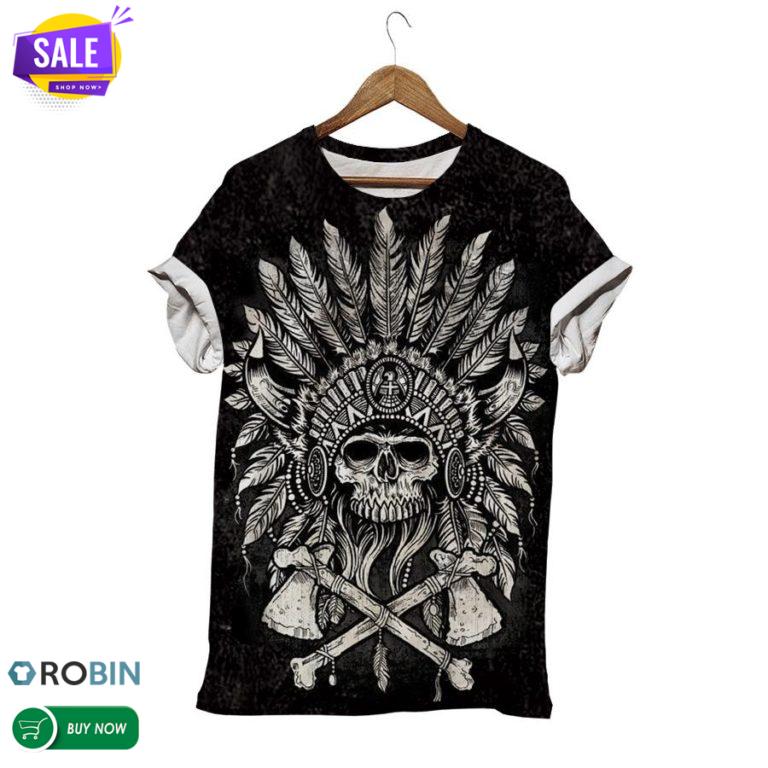 SKULL WEARING INDIAN HAT T-SHIRT.