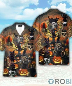 Skull With Black Cat Halloween Hawaiian Shirt features