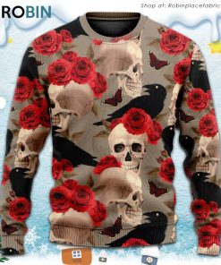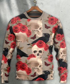 Skull With Rose Flower And Raven Gothic Style Ugly Christmas Sweater details