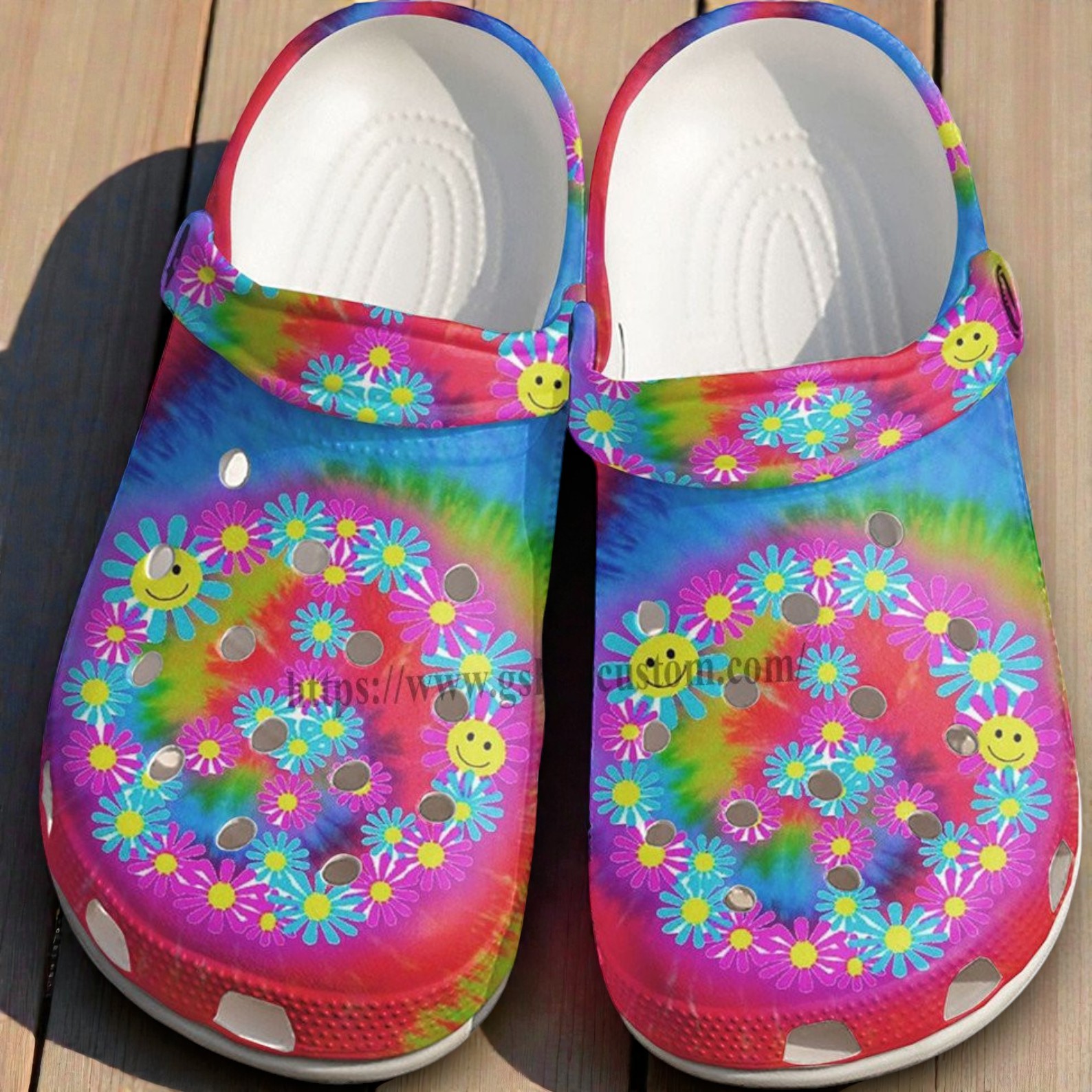 Step into a world of groovy vibes with these dazzling shoes! Picture yourself walking on sunshine with cheerful daisies and rainbows swirling around your feet. The bright colors and happy smiles capture the essence of peace and joy, making every step feel like a sunny day at the beach. Ready to spread some positive energy? Snag your pair today and let your feet do the talking!