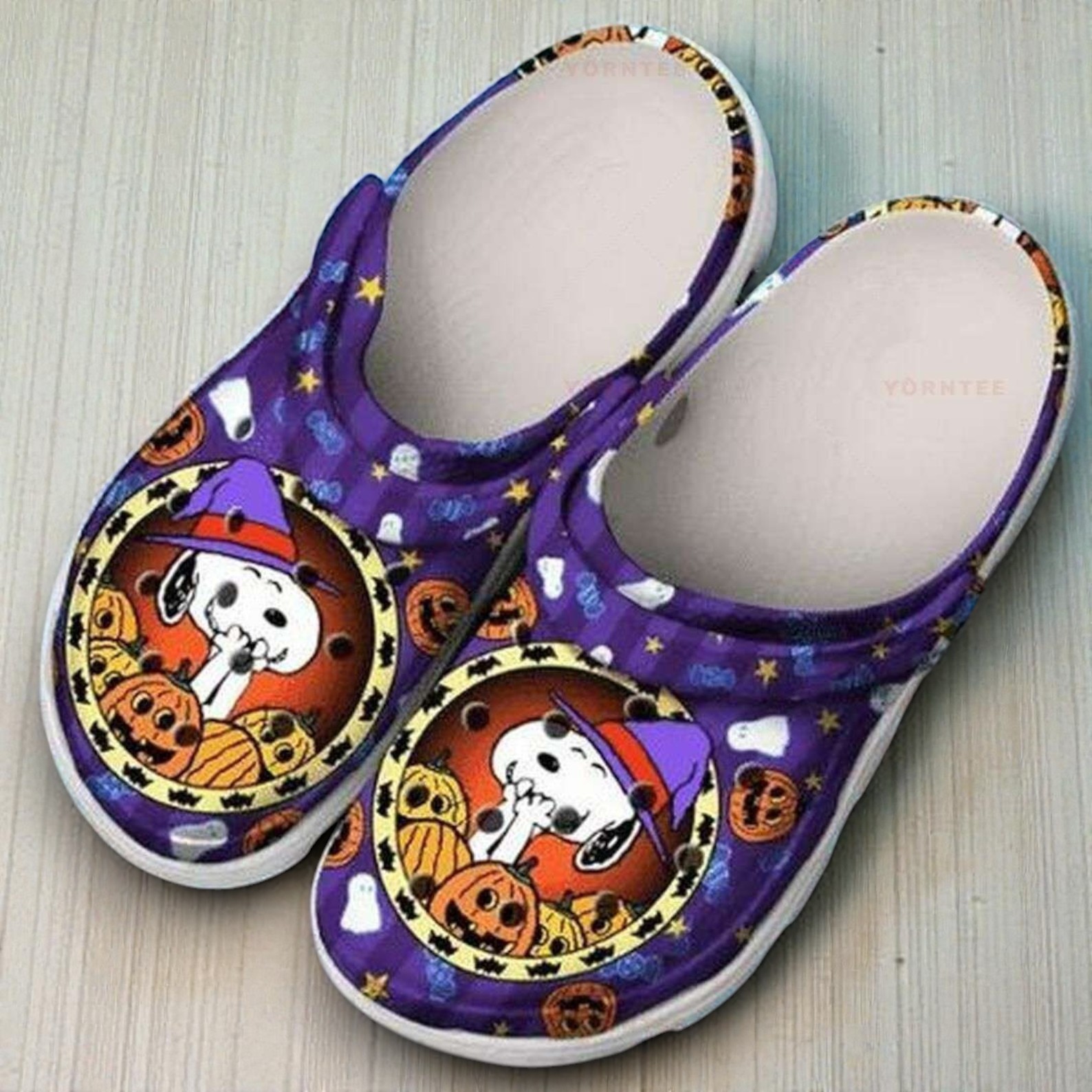 Getting ready for October or just really love classic cartoons? These Snoopy Halloween Crocs are a great addition to your everyday routine. The print focuses on Snoopy wearing a purple witch hat surrounded by carved pumpkins, all set against a fun purple background filled with floating ghosts, stars, and candy. It has a great nostalgic vibe for any Peanuts fan.