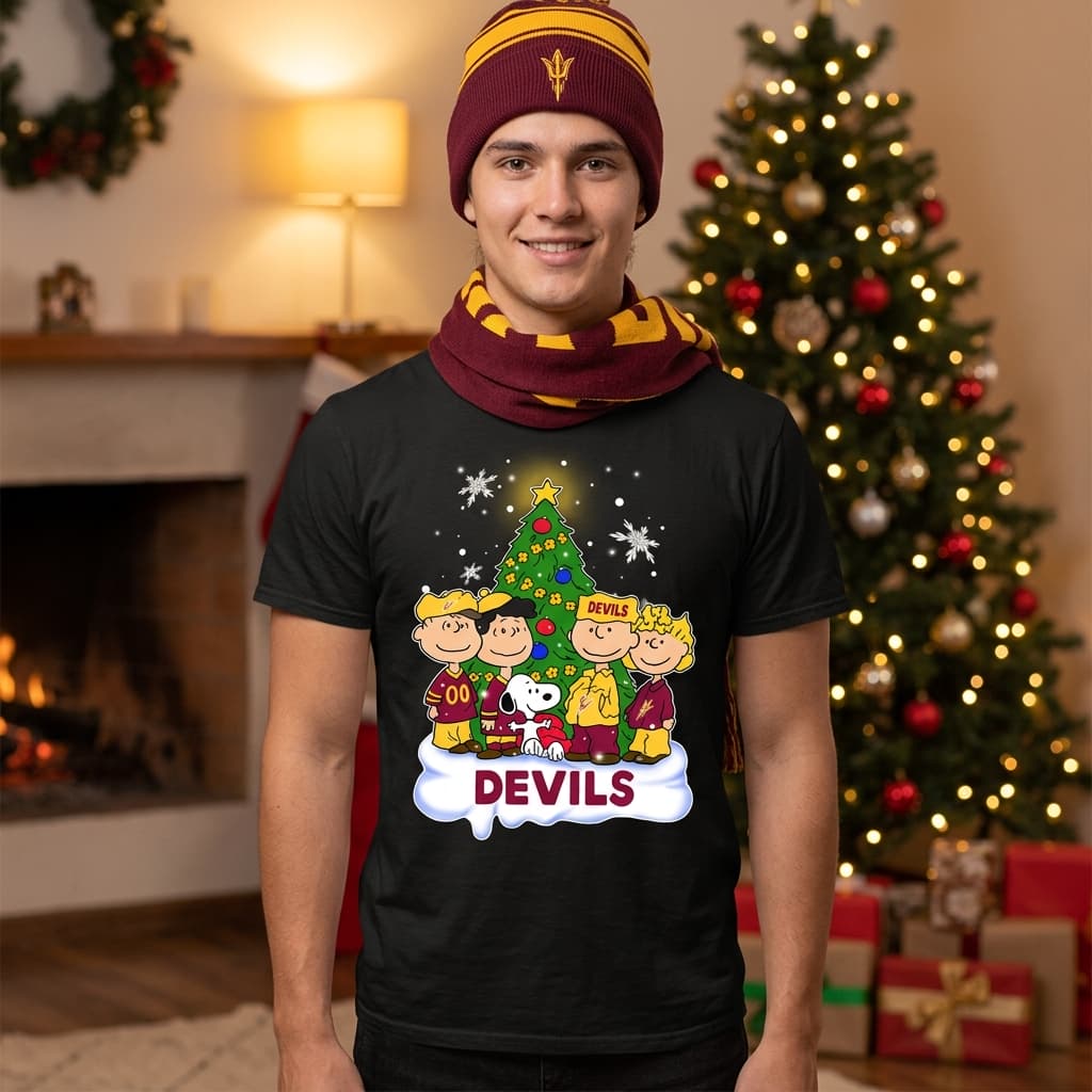 Snoopy lounges beneath a Christmas tree dusted with snowflakes, his iconic ears perked up in cheerful mischief. The bold red block letters spelling out “DEVILS” frame the scene, anchoring it firmly to the spirited Arizona State Sun Devils fandom. The artwork skillfully merges two worlds: the timeless charm of Peanuts with the energetic pulse of college sports culture. Every detail, from Snoopy’s playful expression to the crisp angular snowflakes, captures a warm sense of holiday cheer wrapped in school pride. This shirt speaks to the heart of those who find joy in both classic cartoons and the fervor of Sun Devils games. It’s more than just festive attire; it feels like an emblem of shared identity—where winter celebrations meet collegiate loyalty. The vivid, cartoonish style carries a lightheartedness that invites smiles, making it an ideal nod to the season for community gatherings or casual days out cheering on your team. Among Peanuts devotees and ASU supporters, this design resonates as a quiet statement of belonging and fun. Whether layered under a jacket at a chilly game or worn at intimate holiday parties, it blends personality and passion effortlessly. The Snoopy Devils Christmas shirt isn’t just clothing—it’s a reminder of those moments when fandom and festivity intersect with unmistakable craftsmanship.