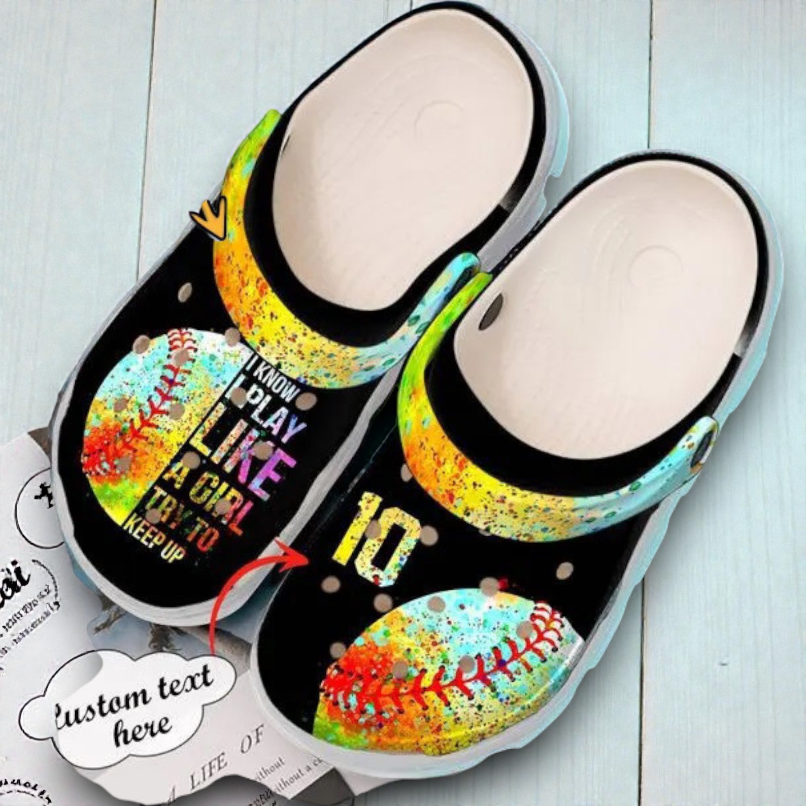 Step onto the field with a statement! These clogs showcase a vibrant softball design with empowering words that remind everyone of the fierce spirit in every game. The colorful splashes and personalized touch make them perfect for athletes who own their style and celebrate their passion. Want a touch of uniqueness for your next practice or game? Personalize them and let your feet do the talking!