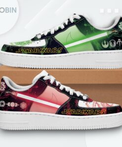 Unleash your inner Jedi with these custom Air Force 1s! Featuring a striking lightsaber art design, these sneakers are a must-have for any fan. Step into a galaxy far, far away with every stride. Grab yours now and may the force be with your feet!