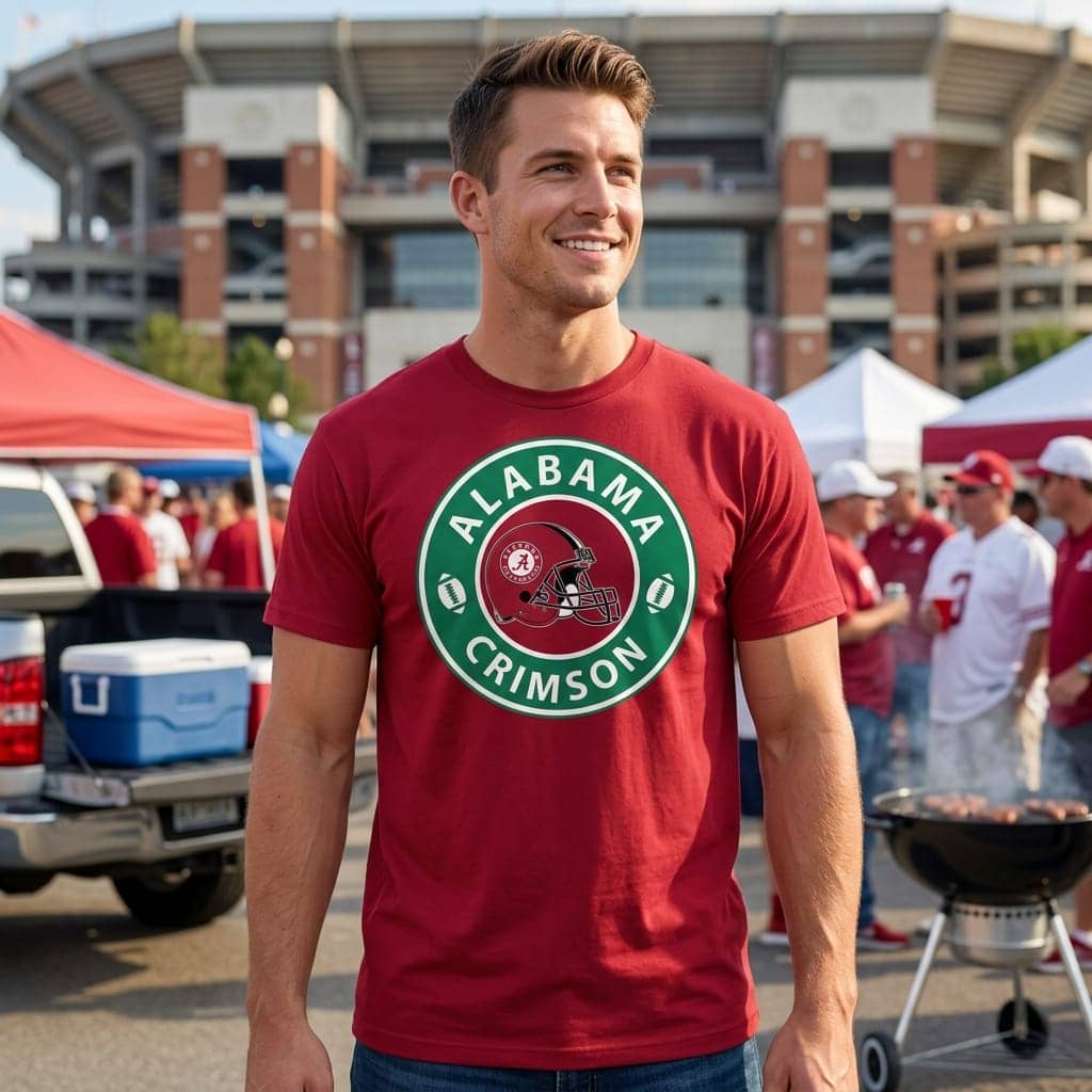 A rich maroon fabric sets the backdrop for bold, energetic imagery that instantly speaks to Alabama Crimson Tide pride. At the center, a green circular logo frames the word Alabama in striking all-caps, bold sans-serif type—clean, confident, and unmistakable. Just beside it, a football helmet icon nods to the team’s storied gridiron legacy, while crisp white borders give the design a sharp, athletic edge. The shirt feels less like merch and more like a statement of identity—a quiet but unwavering shout from the sidelines. This Alabama Crimson Tide shirt fits comfortably into the casual, spirited world of game days and tailgating. It’s the kind of shirt worn by alumni who remember the roar of Bryant-Denny Stadium as if it were yesterday, or by students making their way through campus between classes, carrying the weight of tradition effortlessly. It isn’t flashy for the sake of style but bold enough to command respect—a balance that mirrors the fans themselves. Pair it with jeans and sneakers for a laid-back look that still holds pride in every thread, or layer it under a jacket when the evening chill arrives on fall Saturdays. Whether heading to a watch party or a casual reunion, this shirt becomes a subtle badge of belonging—perfect for anyone who wears their Alabama Crimson Tide loyalty as naturally as their favorite old team cap.