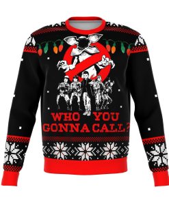 This Stranger Things Who You Gonna Call Premium Ugly Christmas Sweater available in adult and youth size.