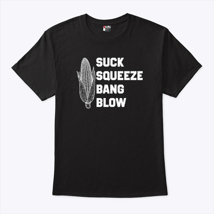 The graphic on this shirt is loud but simple, like a punchline that lands without a second thought. Bold, blocky letters stack vertically, each word commanding attention with unapologetic clarity. Nestled within this typography is a crisp white corn illustration, a clever nod that cuts through the words’ aggressive tone with a pinch of ironic humor. The black background serves as a sharp canvas where the contrast feels electric—clean, minimal, yet impossible to overlook. It speaks to those who own a certain swagger, an edgy humor that thrives on playful rebellion and inside jokes woven through streetwear culture. The phrase embraces a raw, kinetic energy that resonates with anyone who’s ever found amusement in things that push boundaries just enough to spark conversation. This isn’t about subtlety—it’s about making a statement without shouting; a balance that felt right at music festivals, late-night hangs, or urban explorations where personal style is its own language. Wearers who gravitate toward this design likely savor the unexpected mashup of irreverence and simplicity. It’s an unmissable nod to creativity that flips the script on typical graphics with a fresh edge. Whether as a gift for friends who cherish humor with teeth or as a staple in the laid-back rotation, the “suck squeeze bang blow” motif becomes more than a phrase—it’s a rallying cry for those who don’t mind standing out in a crowd.