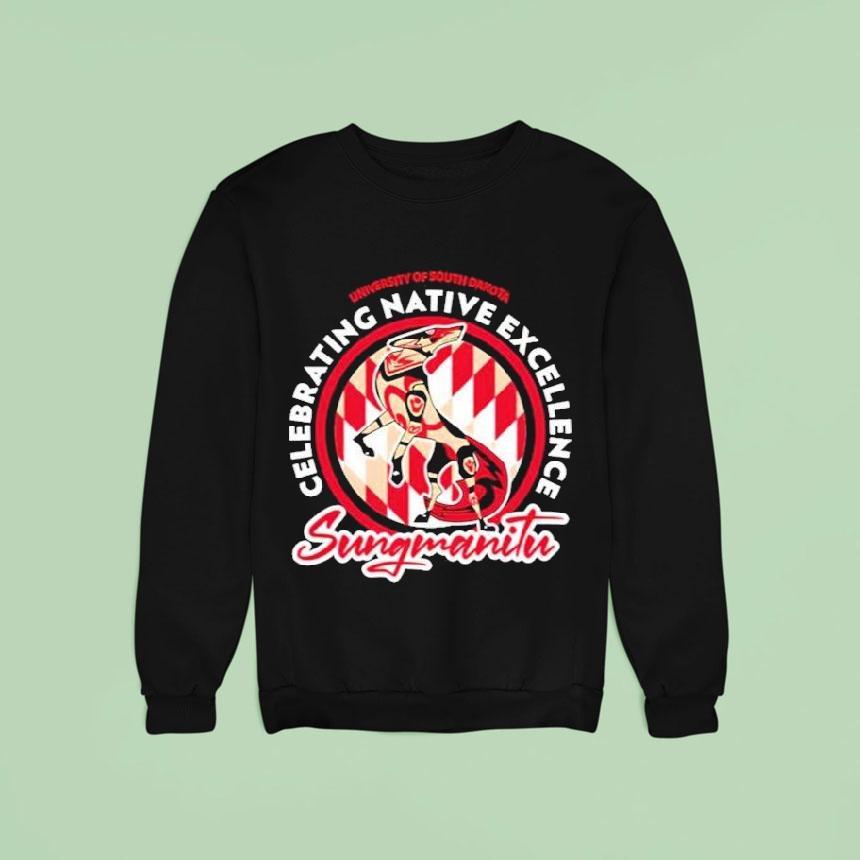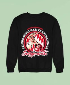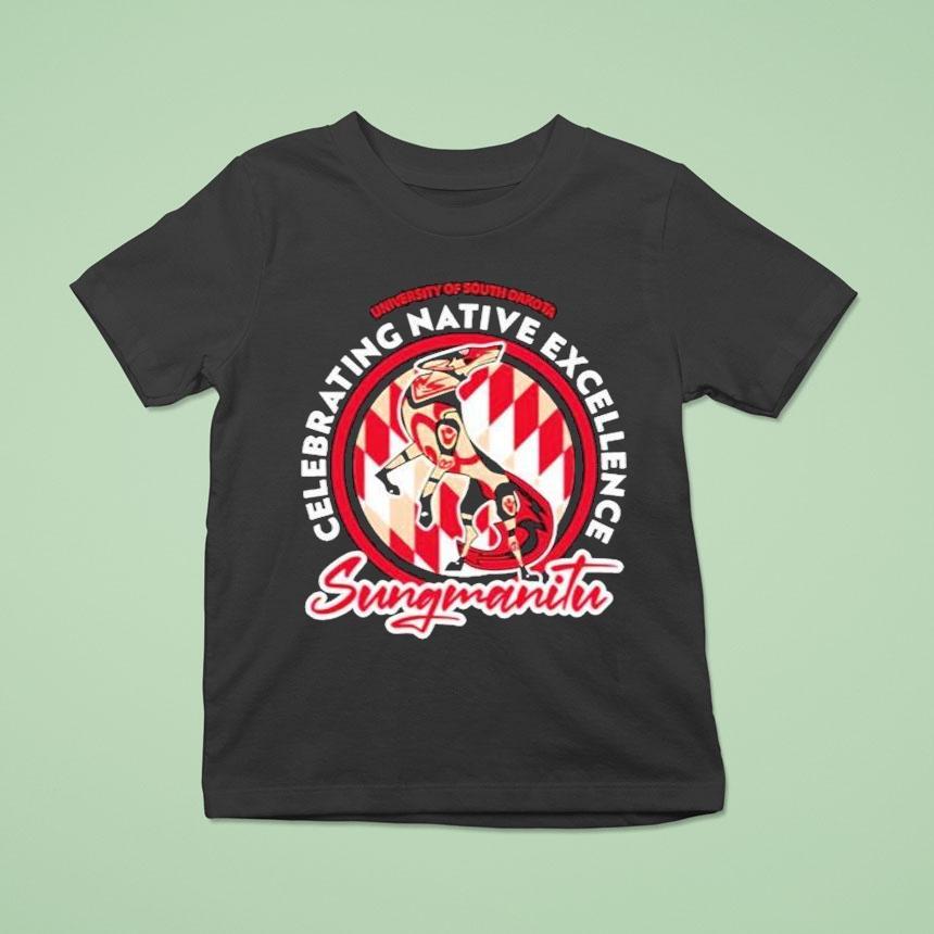 The weight of the black fabric grounds the design, its deep charcoal shade a stark canvas against which the sharp red and white diamond pattern pulses with striking clarity. At the center, a stylized figure stands framed by a bold circular emblem, the geometric shapes evoking traditional Native American motifs while feeling clean and modern. Curved text in uppercase type hugs the circle’s edge, commanding attention without overpowering the imagery. Below this, a scripted name winds its way across the shirt, offering a personal, almost signature touch that softens the strong graphic elements. Each visual choice conveys more than style—it speaks to identity and pride. The diamond pattern recalls woven artistry found in Native American heritage, a nod to stories that have survived through generations. The bold graphics and collegiate vibe feel simultaneously rooted in culture and contemporary celebration, making it a fitting piece for honoring heritage at cultural events or simply integrating that respect into everyday wear. Those drawn to the shirt might be students exploring their roots, supporters standing in solidarity, or anyone who cherishes the artistry and history it encapsulates. Wearing it could feel like carrying a piece of that legacy into the modern world, expressing individuality with intention. The name Sungmanitu comes through as not just a label but a call to remember and celebrate that lasting connection, wherever the day takes you.