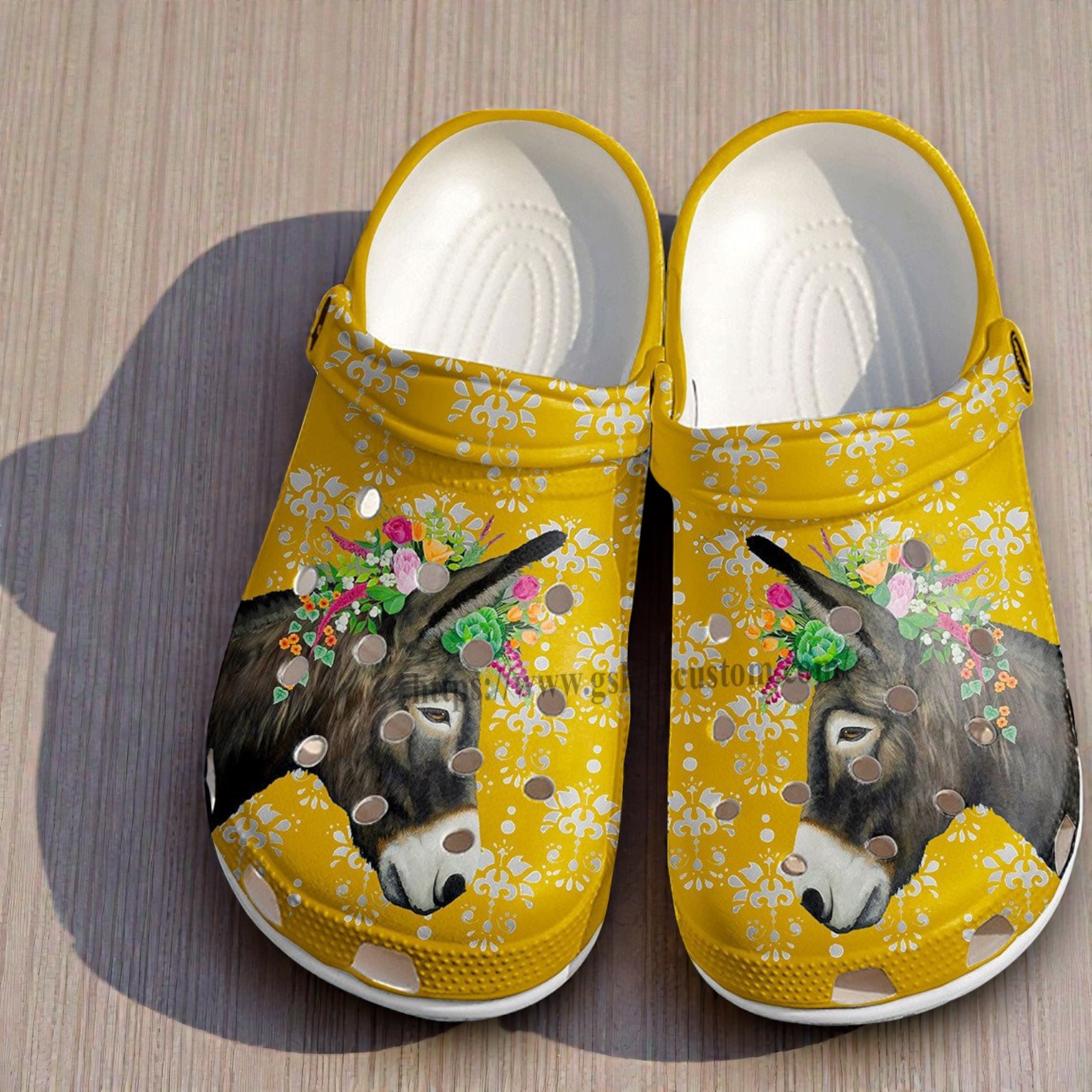 The design features a warm, mustard-yellow background covered in a delicate white lace pattern. The star of the show is the gentle donkey, beautifully painted with a colorful crown of pink and orange flowers. It’s a sweet, rustic look that feels like a perfect summer day in the country.