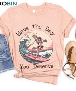 Surfing Skeleton Have The Day You Deserve Shirt is the perfect way to express the carefree attitude inside. It features a unique graphic of a skeleton surfing with the text “have the day you deserve” printed underneath. This shirt is made with a comfortable fit and high-quality fabric that makes it ideal for days spent out in the sun. It’s also durable and can easily be washed for a longer lasting look. The bright colors and fun graphic makes this shirt a fun way to spread a humorous message about living life to the fullest. Whether you’re at the beach, at a backyard barbecue, or just lounging around the house, this shirt is sure to express the light-hearted attitude that comes with a liquid lifestyle.