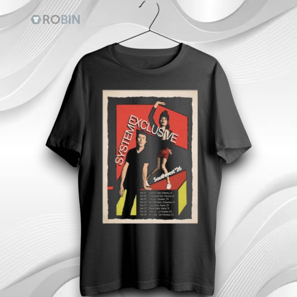 Synth beats, desert highways, and dark stages. Celebrate the System Exclusive Southwest '26 run with this official tour t-shirt. The design captures the band's signature post-punk energy with a retro, collage-style graphic that feels straight out of an 80s underground club.