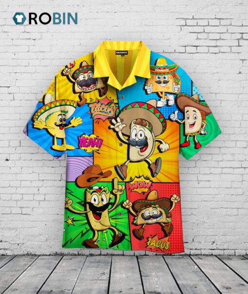 Bring the fiesta to your luau with this vibrant mashup! This hilarious Hawaiian shirt features tacos and pop art, blending Mexican flavor with island vibes. Perfect for summer parties, beach days, or just livening up your wardrobe. Get yours now and be the life of the party! 🌮🌺