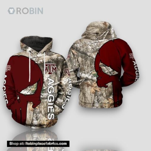 Texas A&M Aggies Camouflage Veteran Hunting and Punisher Skull 3D Hoodie Texas A&M Aggies Gifts For Her features